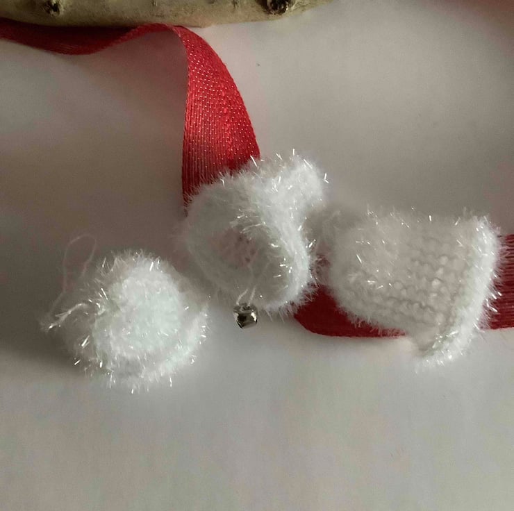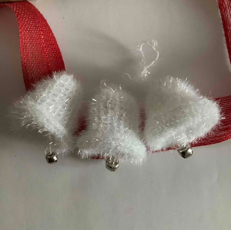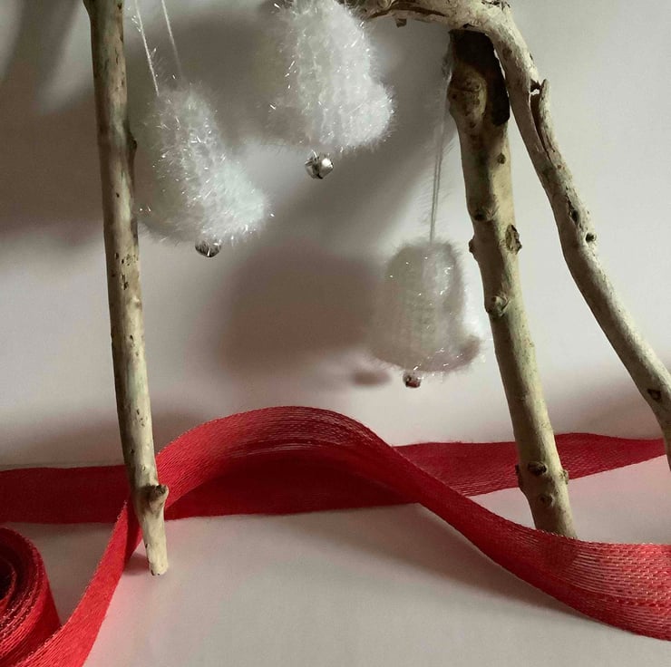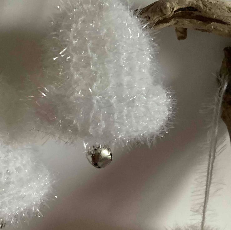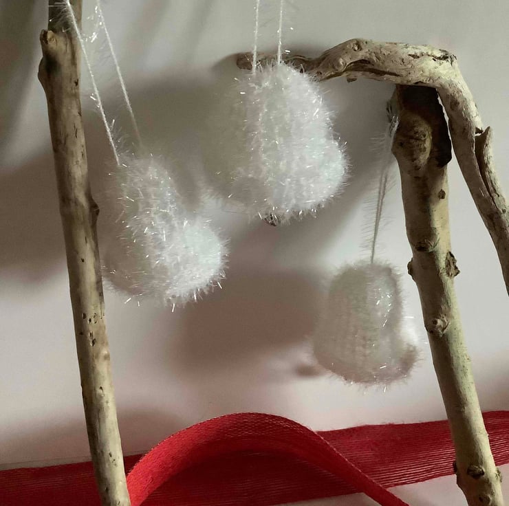 A set of 3 hand knitted sparkly white bells with a little silverbbell hanging inside. Lovely to add on to your Christmas tree or to decorate a gift or even just pop into a Christmas stocking.