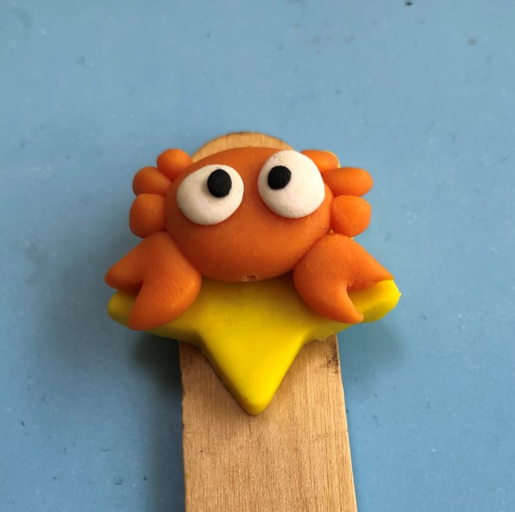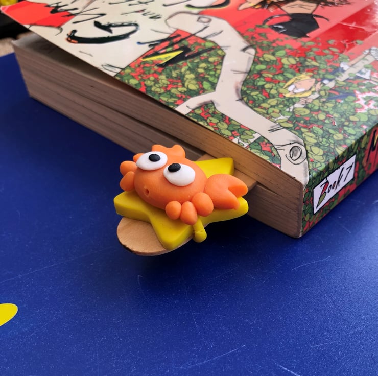 This quirky little polymer clay crab makes a lovely way to keep your place in your diary or a good book - a great, inexpensive gift or stocking stuffer for avid readers. This little pincered pal crab measures approximately 3cm x 3cm and is mounted on a 15cm wooden bookmark. The perfect guardian to help you keep your place on any literary adventure...