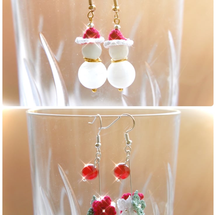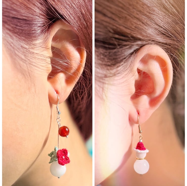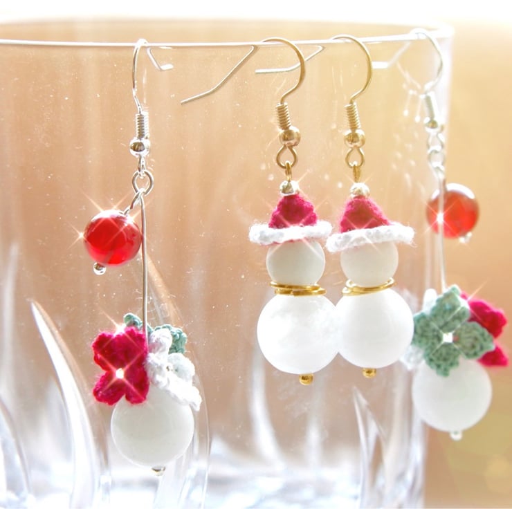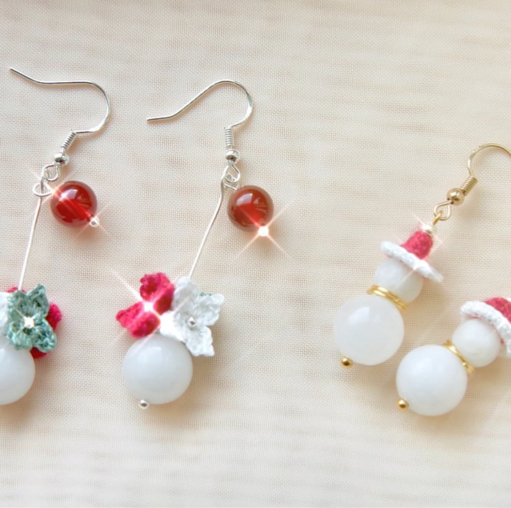 Microcrochet Snowman earrings made with 12mm White Agate, 8mm Morganite and Embroidery Threads.
