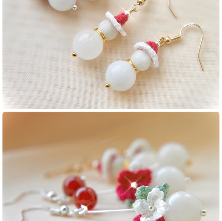 Christmas Microcrochet floral earrings made with 12mm White Agate, 8mm Red Carnelian and Embroidery Threads.