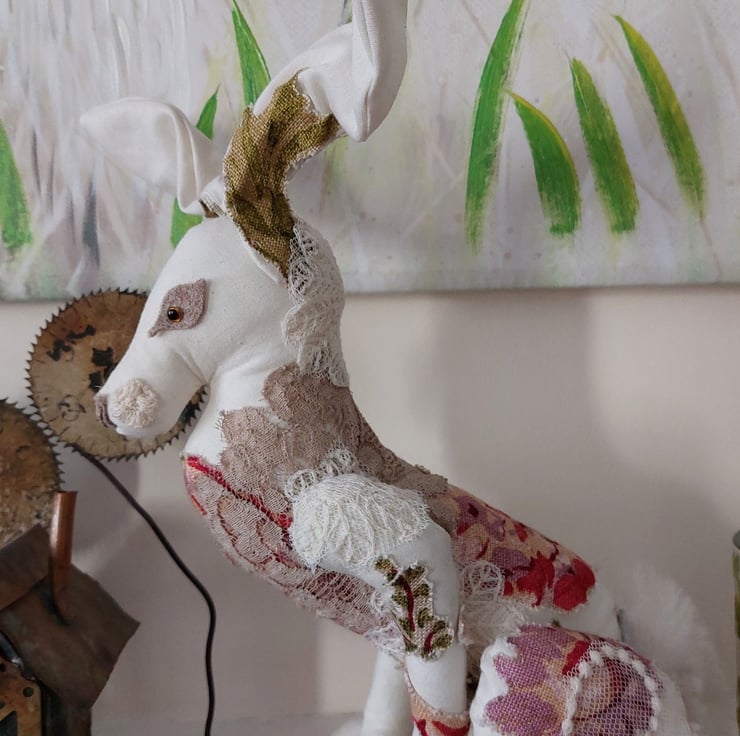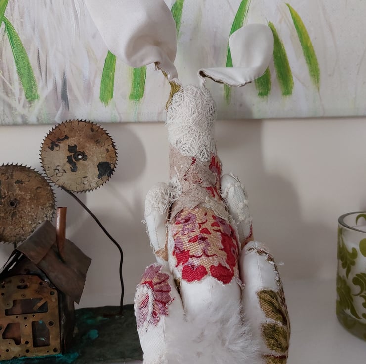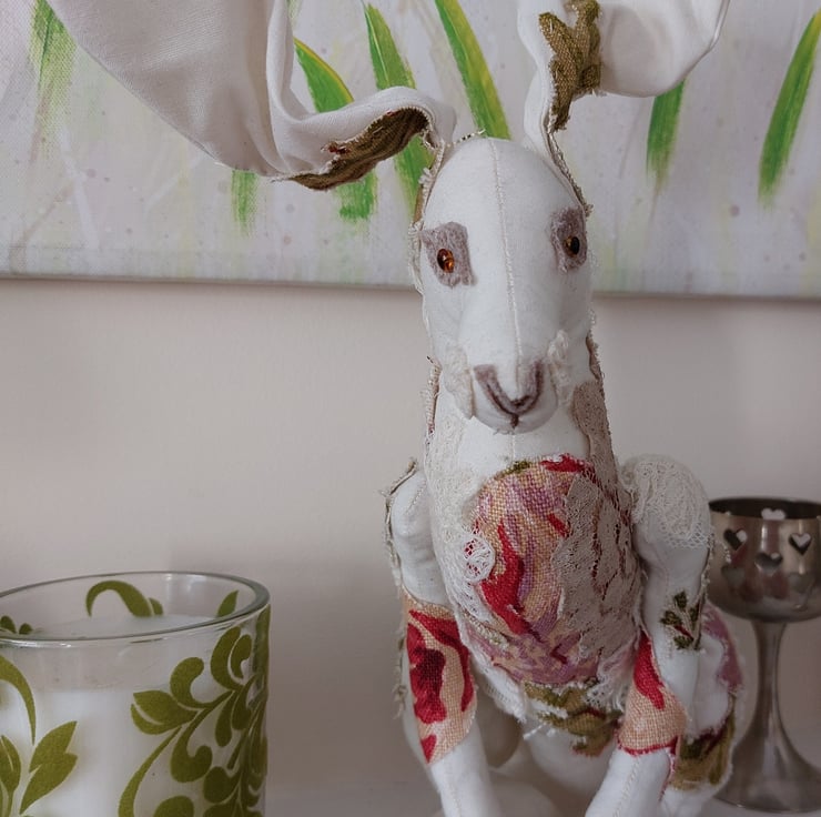 This hare has been hand crafted using thrifted fabric remnants and recycled materials.