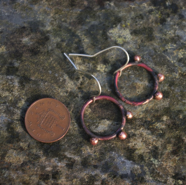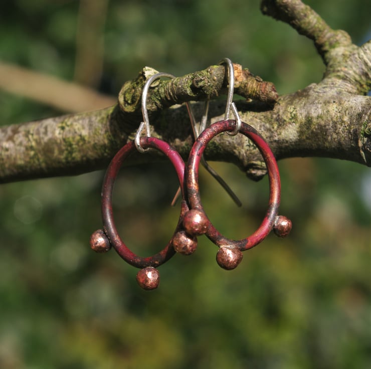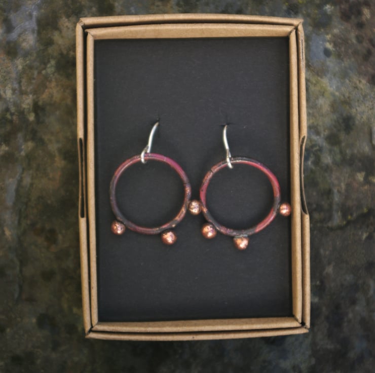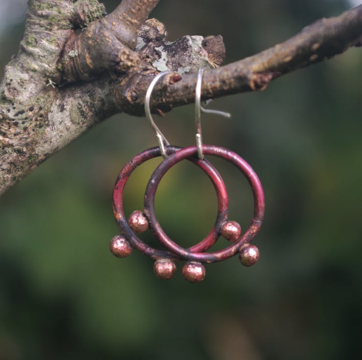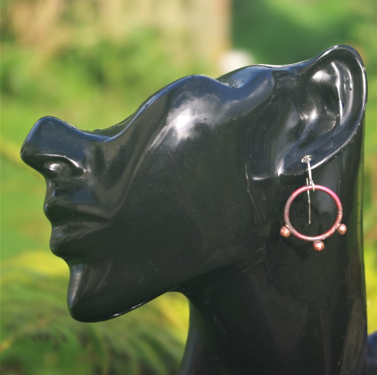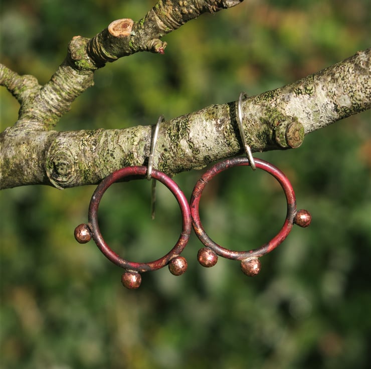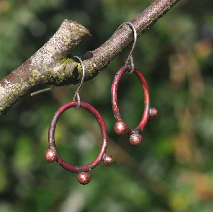 A circle, made with thick, recycled copper wire with 3 shiny copper 'seeds' soldered to the outer edge. The circle has deep red tones as a result of heat and makes a great contrast to the shiny copper. The circle will swivel around on the hook , so that the copper 'seeds' will not stay in the same place.