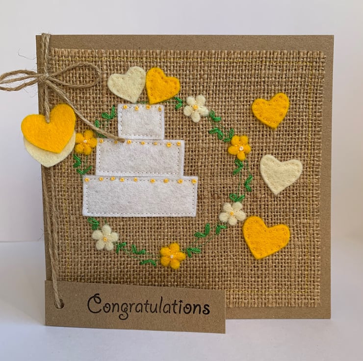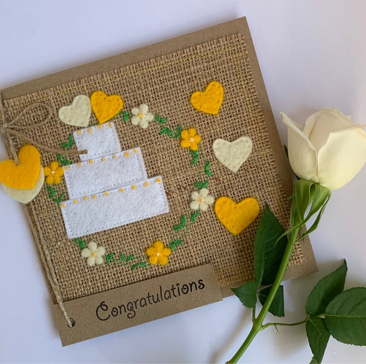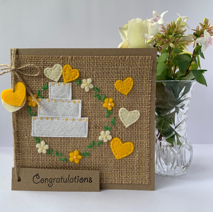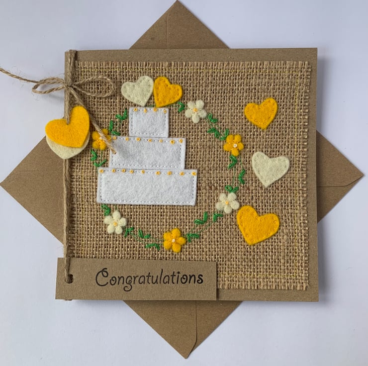 This unique handmade wedding card is decorated with a white wedding cake inside a circle of yellow and cream flowers. Hearts in cream and yellow decorate the top of the cake.