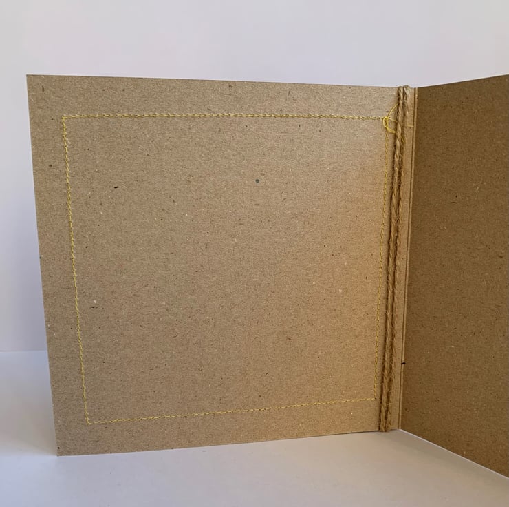 The hessian is machine stitched using a contrasting thread, onto a plain brown recycled card. This stitching is visible on the inside of the card.