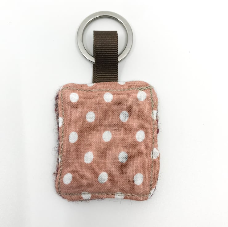 The split ring is made from surgical steel and is joined to the keyring with a brown grosgrain ribbon.