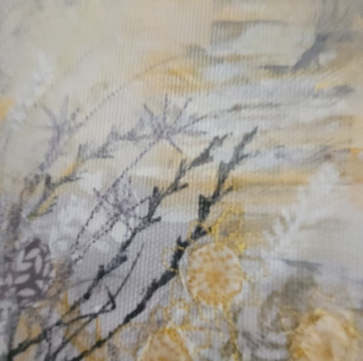 An early morning walk around the lake, the ethereal light on the morning mist as the sun rises. The dewdrops glistening on the grasses and seedheads. The stillness and peacefulness of such a beautiful place inspires this piece of art.