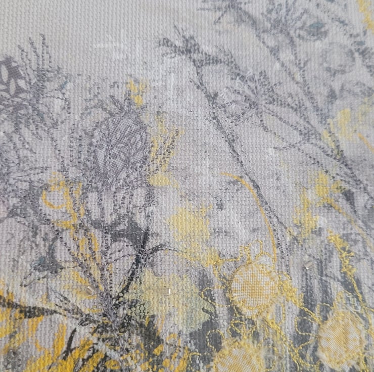 Layers of paint built up with mono printing using grasses and seedheads collected from walking around the lake. More details are added with free motion embroidery. Tiny seed beads add more interest, emulating the dewdrops on the grasses and wild flowers.