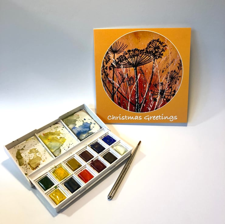 These 135mm square Christmas cards feature my ink and watercolour painting of Winter Seedheads and grasses. They come with a pristine white envelope and are blank inside for your own message. Four in a pack-two yellow and two red
