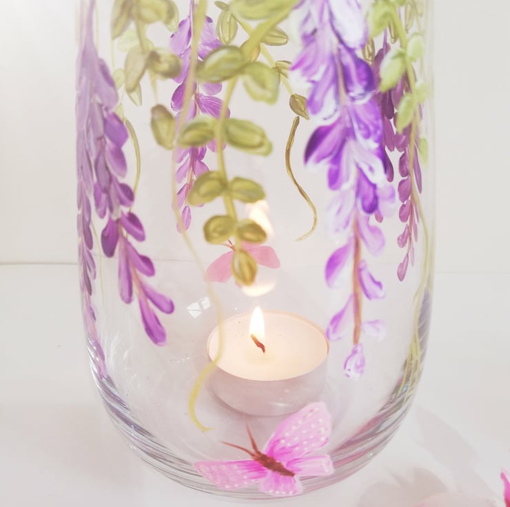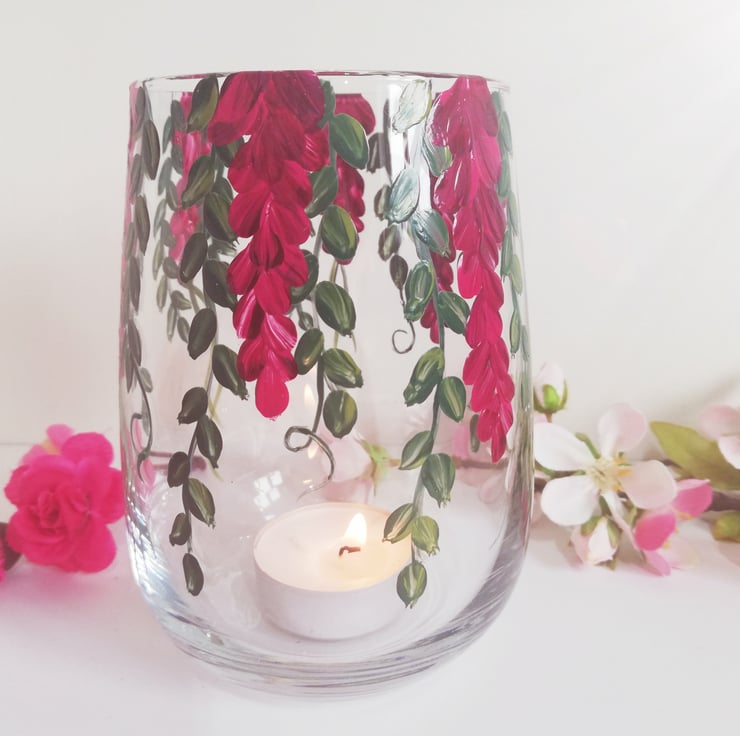 The stemless glass has been hand painted with glass enamel in an eye catching wisteria design in a choice of either purple or burgundy.with soft flowing leaves and swirls.