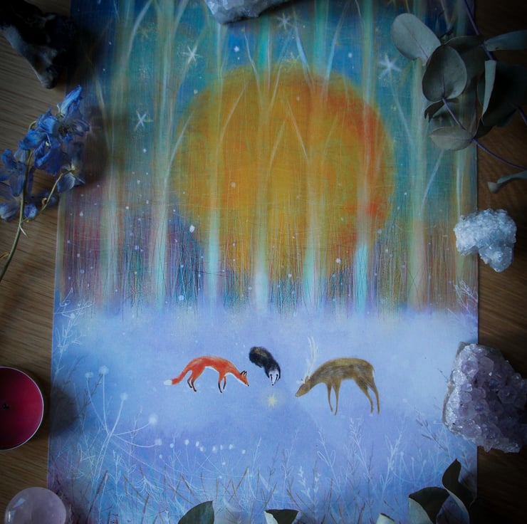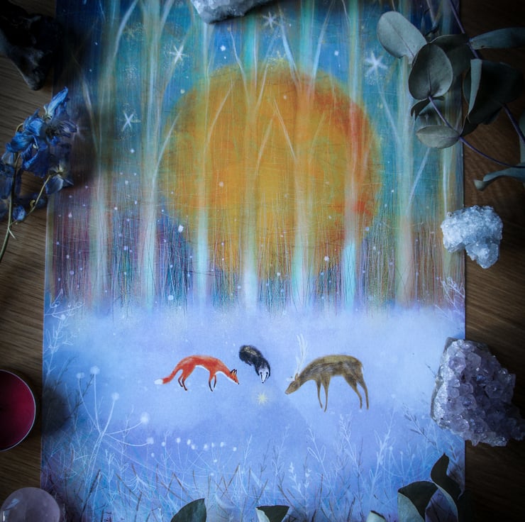 The artwork depicts a winters day with spiderwebs, plant life, a rising winter sun with twinkling stars and a fallen star laying in the snow, animals such as a stag, badger and fox investigate this new arrival.