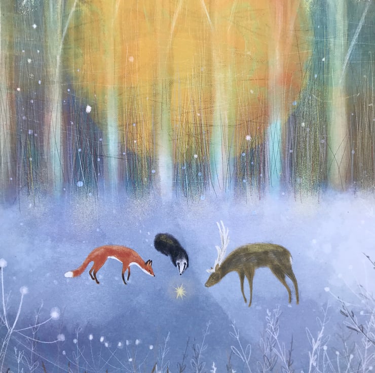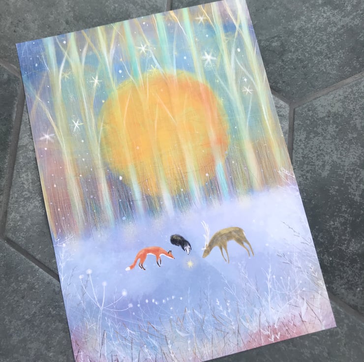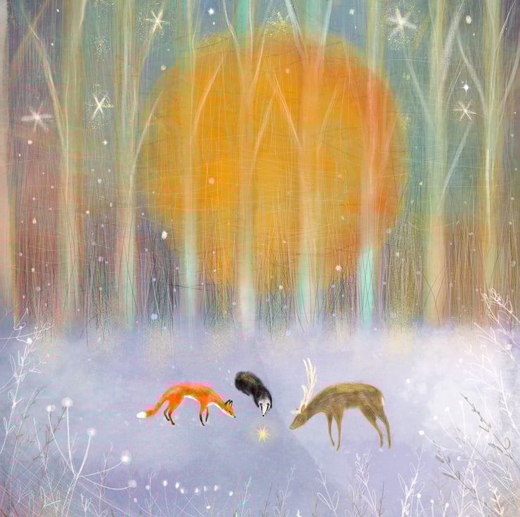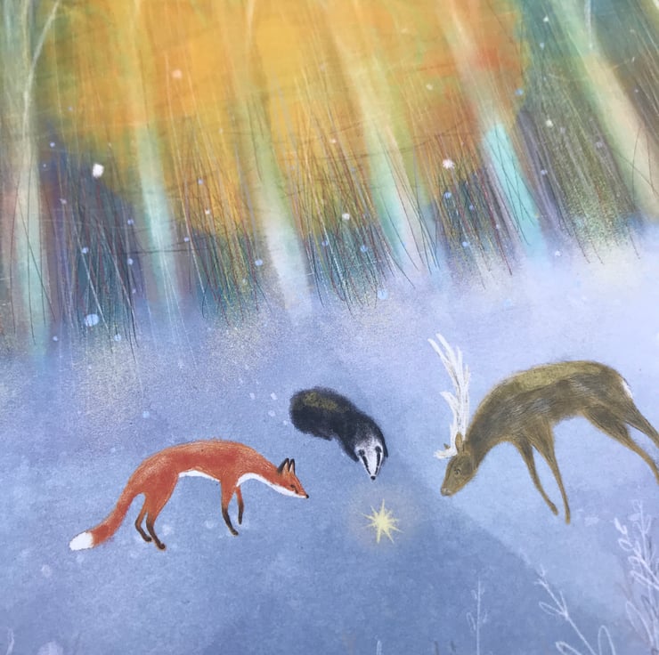 The artwork depicts a winters day with spiderwebs, plant life, a rising winter sun with twinkling stars and a fallen star laying in the snow, animals such as a stag, badger and fox investigate this new arrival.