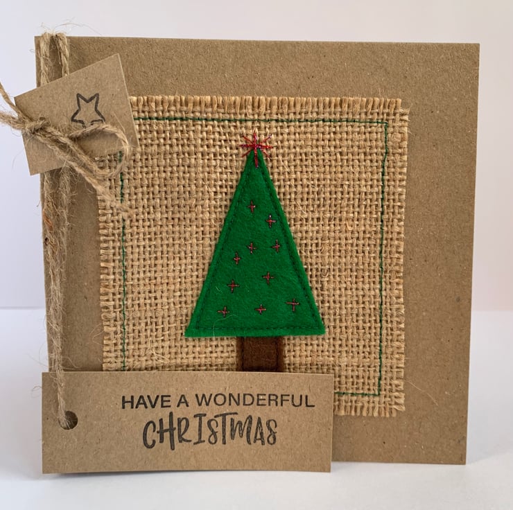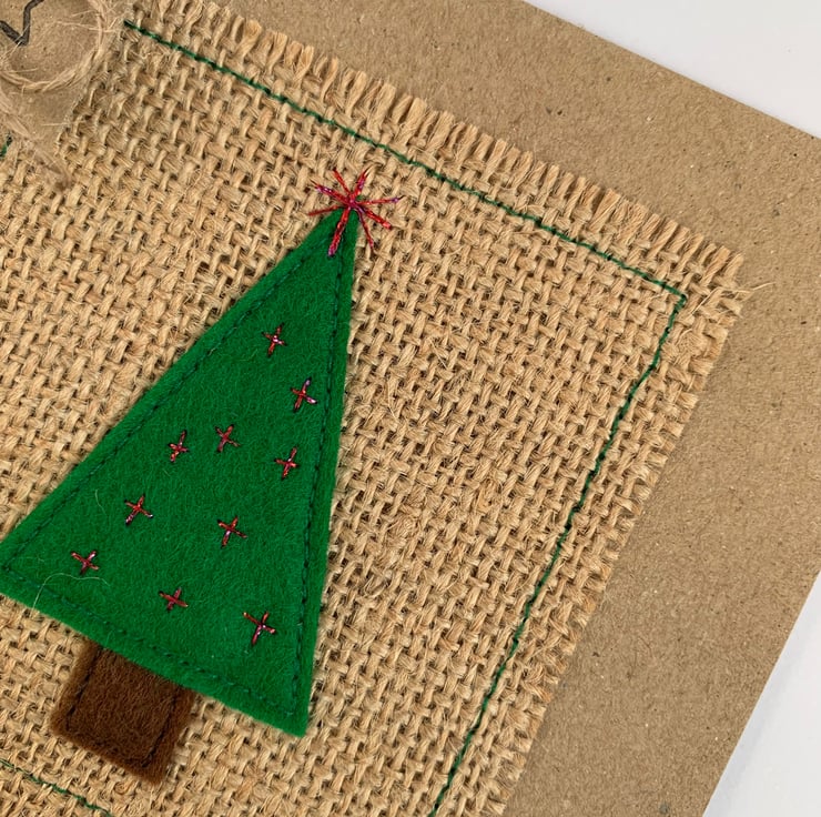 This handmade Christmas card is decorated with a green festive tree. The decoration is hand cut from 100% wool felt and machine stitched to hessian, added sparkle is hand sewn using a pink coloured metallic thread.