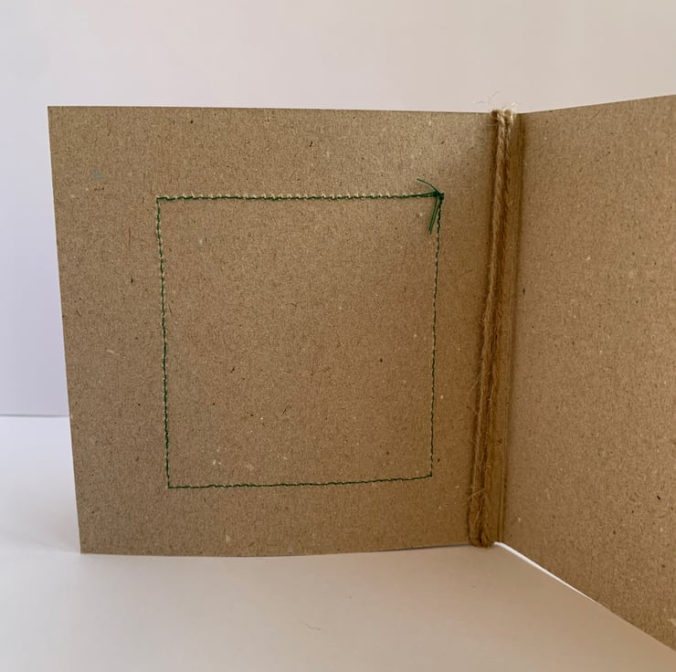 The hessian is machine stitched, using a contrasting thread, onto a plain brown recycled card. This stitching is visible on the inside of the card.