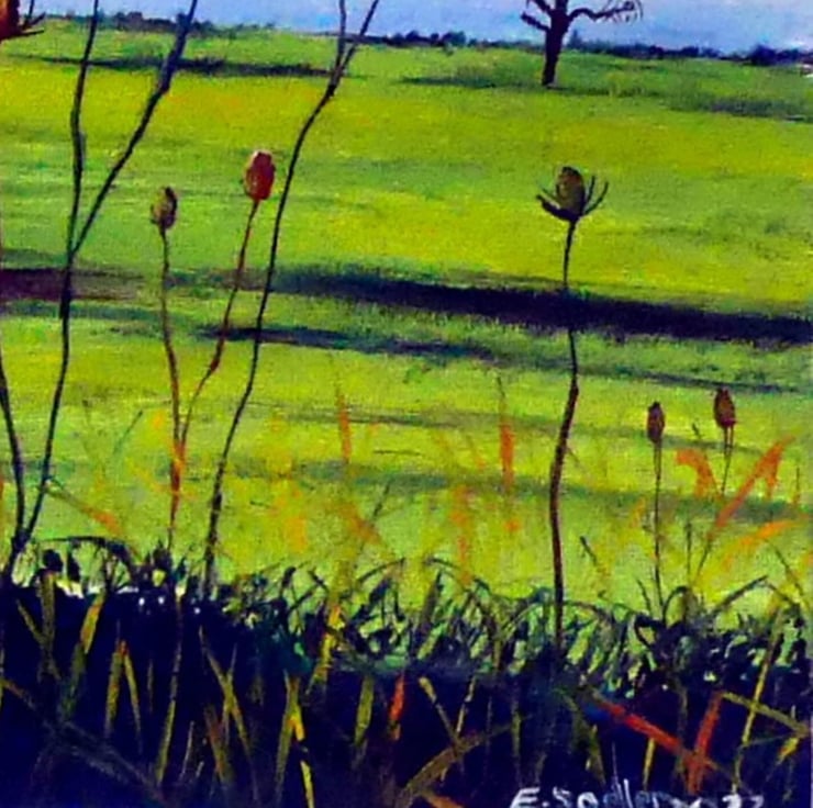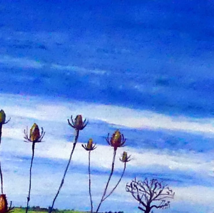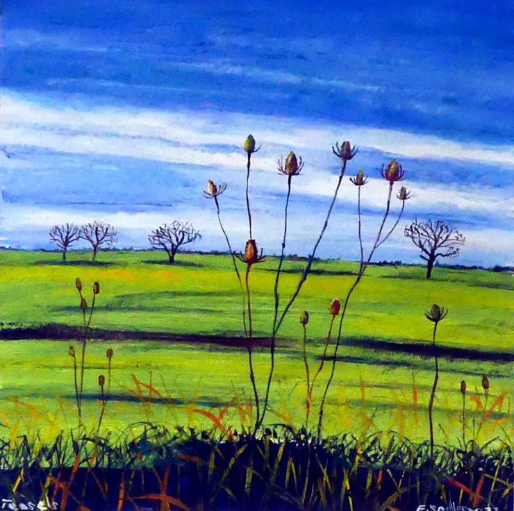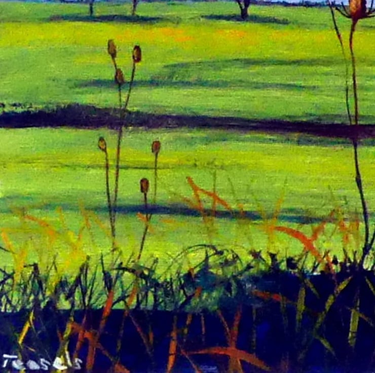 A small square landscape oil painting of fields and teasel wildflowers under a blue sky inspired by one of my walks across the fields in the fens in early spring. Teasels left over from the previous summer may yet provide some food for wildlife having stood tall through the strong easterly winds of the winter.