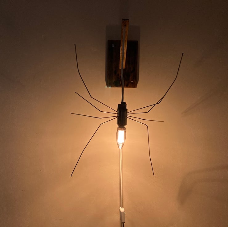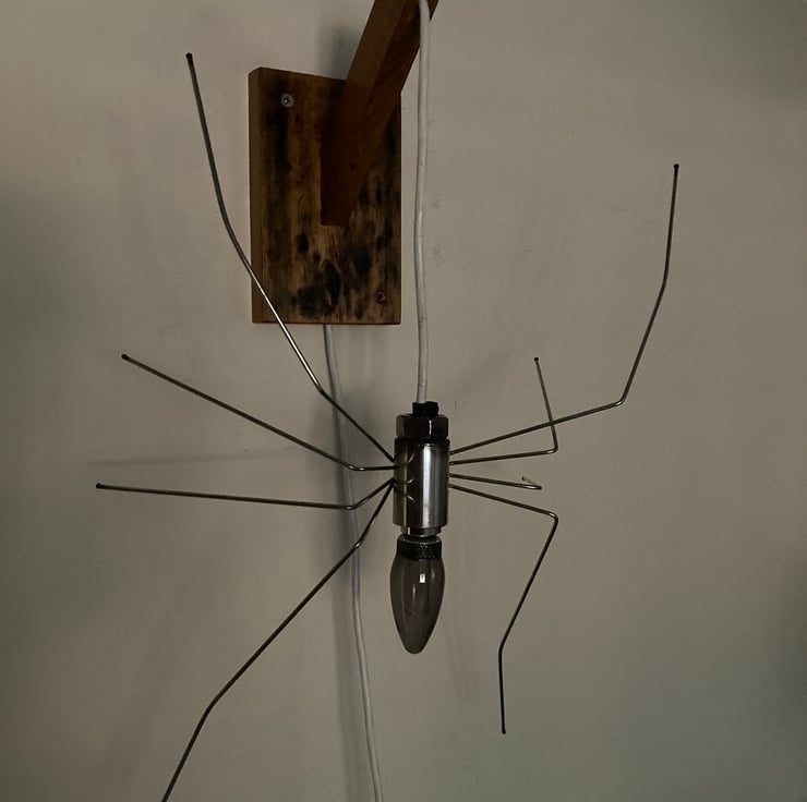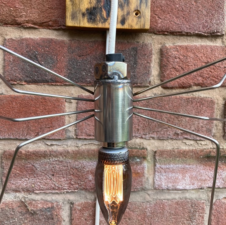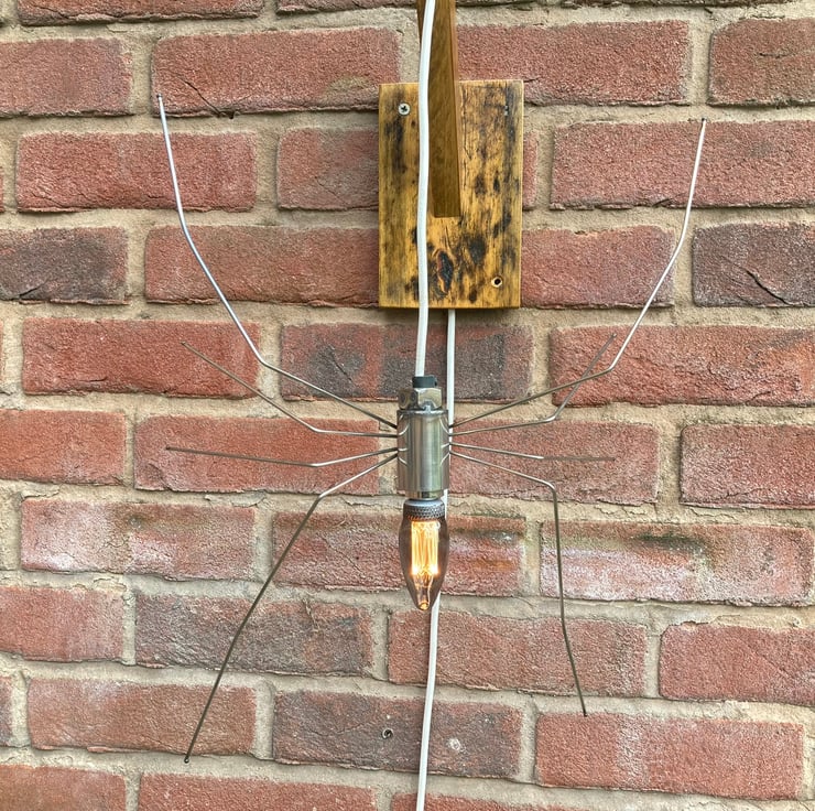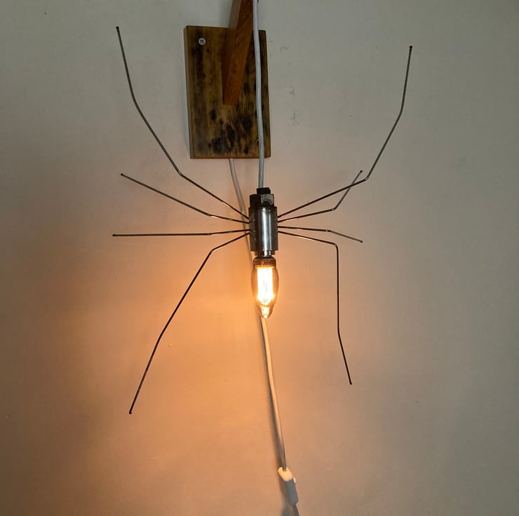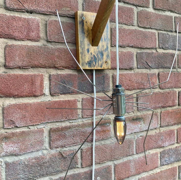 A highly unusual wall sconce, a steampunk spider made from stainless steel hanging from a ‘web thread’ flex supported by a reclaimed wood bracket. The bulb is the spider’s abdomen.