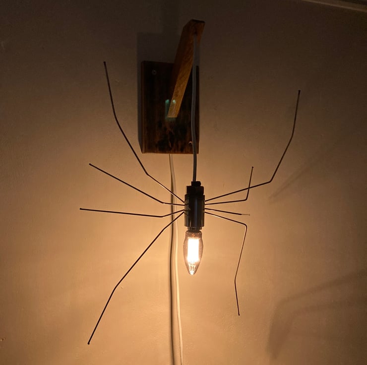 The spider’s head, body and legs are made from food grade stainless steel offcuts, welding rods and a washer and nut all welded together. The ends of the spider’s legs have been ‘balled’ with the welder and care has been taken to remove any sharp edges. Contained within the body is a new nickel-plated SES size lampholder with a smoked 2 Watt LED squirrel cage candle bulb, selected for its low light gothic look, forming the abdomen. The spider hangs from a white flex attached to a bracket made from reclaimed timber – 1930s floorboards – which have been lightly sanded and French polished to seal in the lovely patina of age