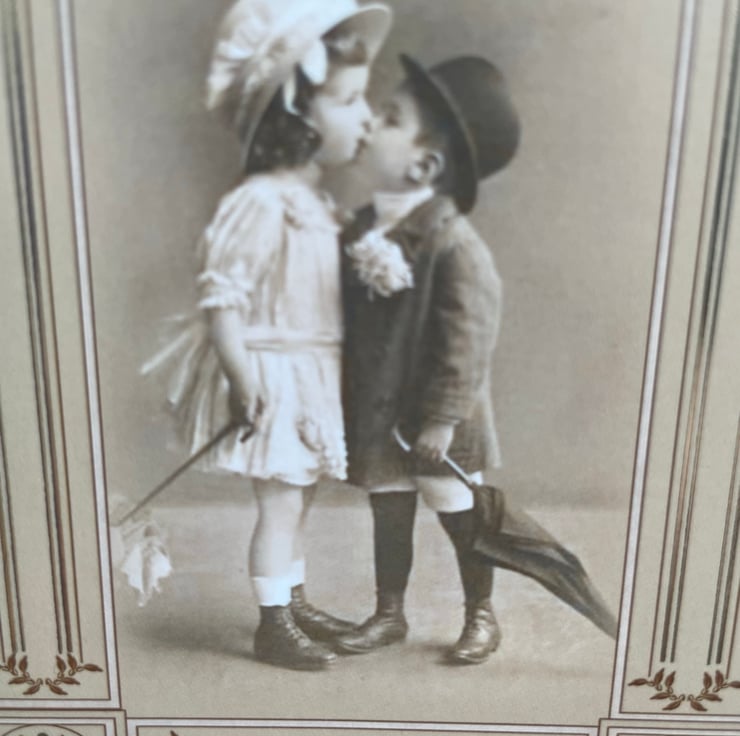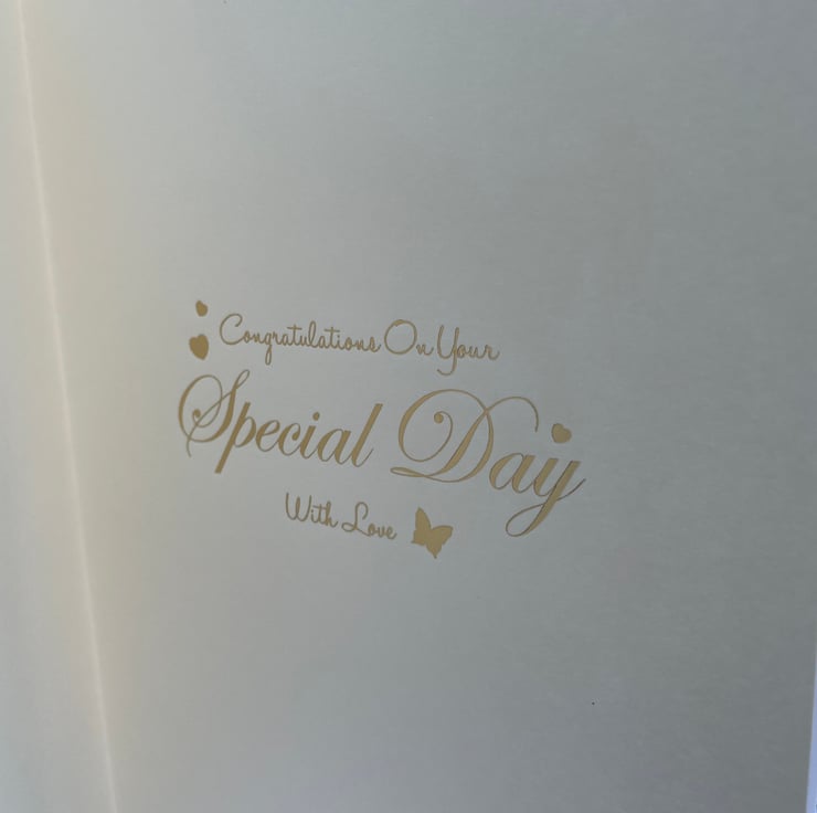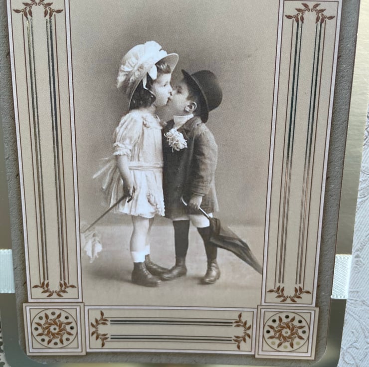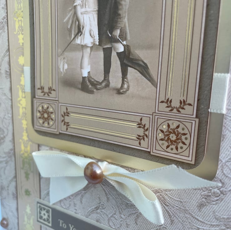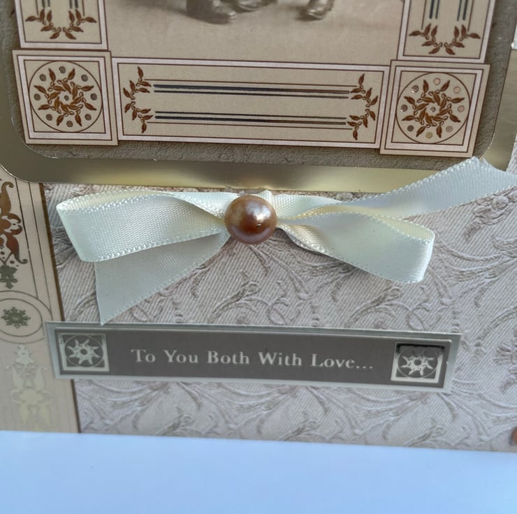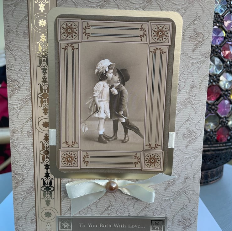 A little vintage style for this beautiful anniversary or engagement card. This A5 sized card is in sepia and cream tones. It features as the main design 2 children dressed in victorian style giving each other a sweet little kiss. This is mounted on gold card then a matching cream swirl design. The design is finished with a cream bow and bronze coloured pearls. The greeting says To you both with love. Inside the card has a cream insert with the greeting Congratulations on your special day. A special card to cellebrate an anniversary or engagement.