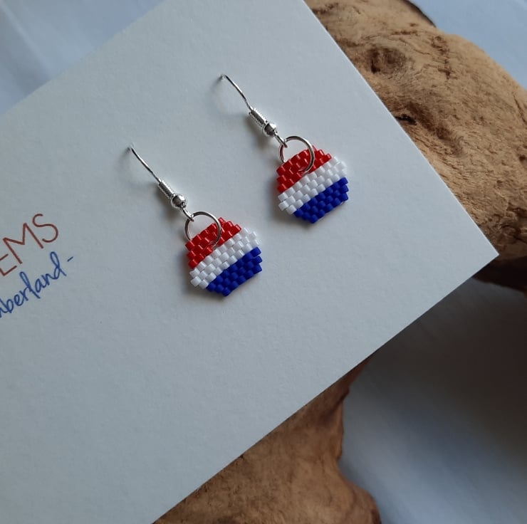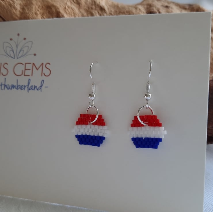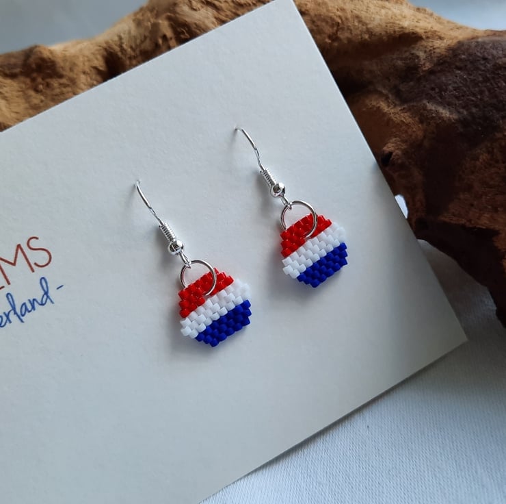 A pair of light weight earrings made using Japanese Delica beads in colours similar to that of the Dutch flag. The earrings have a drop of approx. 1.5cm from the base of the ear wires and are approx 1.5cm wide. The ear wires are silver plated but can be changed to sterling silver at check out.