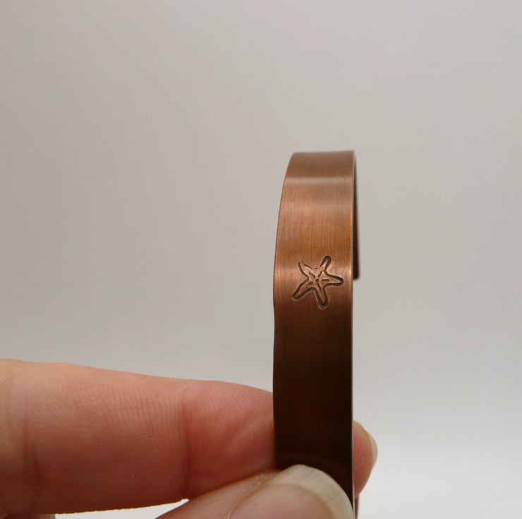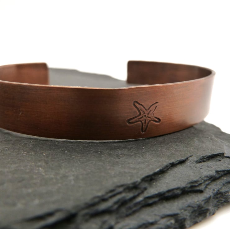 A copper cuff bracelet which I have handmade using copper sheet, it has been hammered and shaped using a oval mandrel and features a hand stamped starfish in the middle.