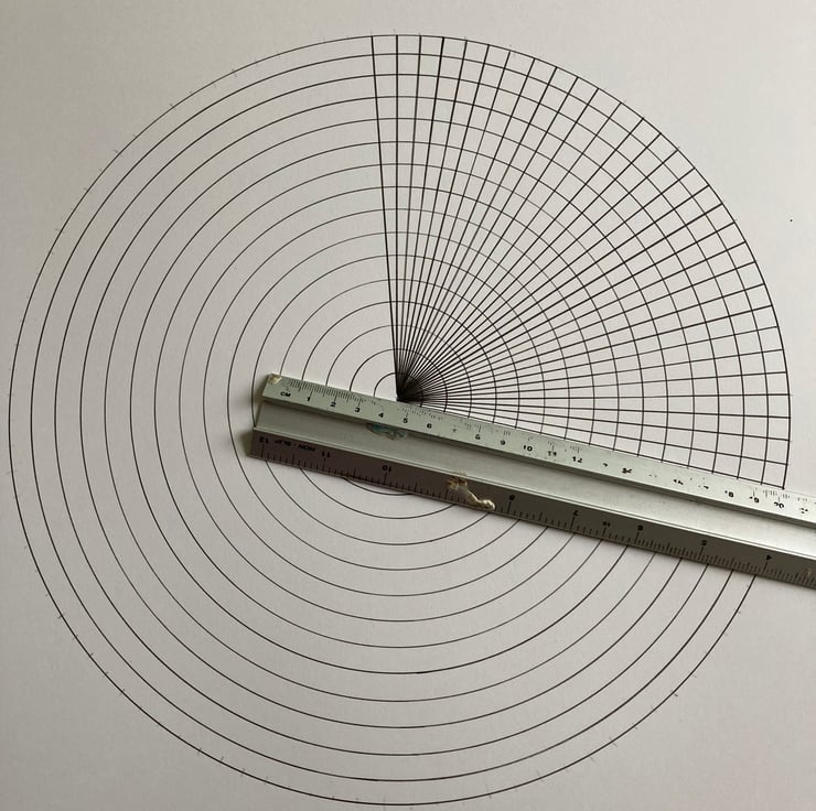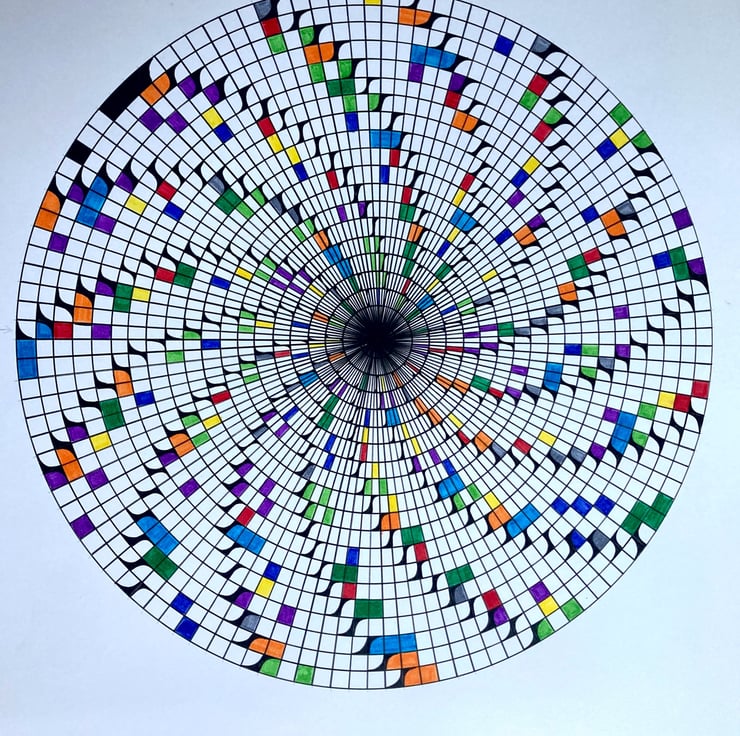 I this piece I have represented Pi in Bianary code on a circle. The I's are in colour and there is a different colour for each number. I have highlighted each binary block with black edging. This is hand drawn and in none fabe ink. The image is 40cm in diameter and is drawn onto A1 Bristol board paper.