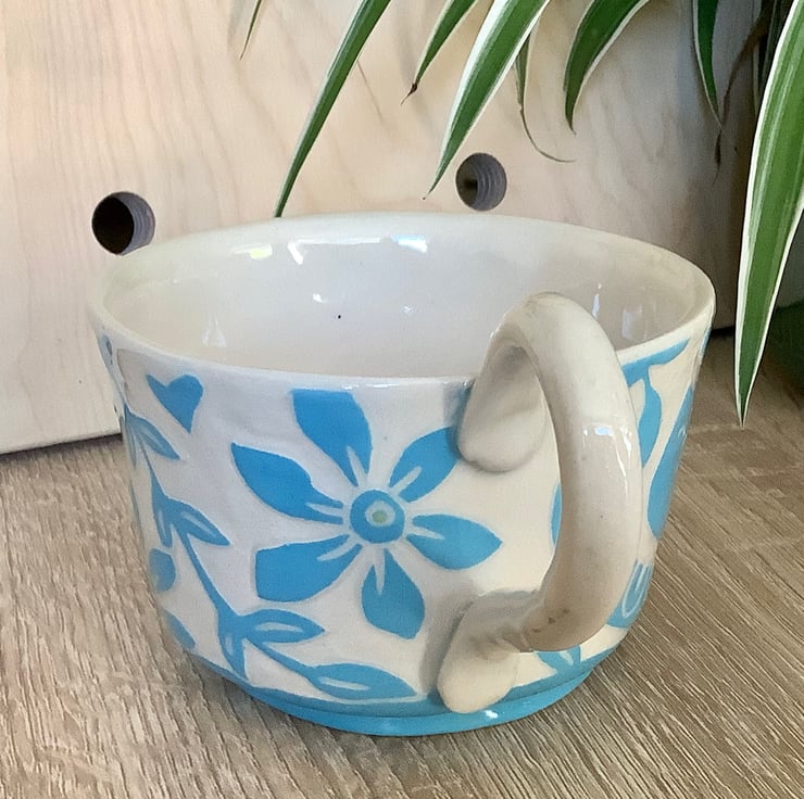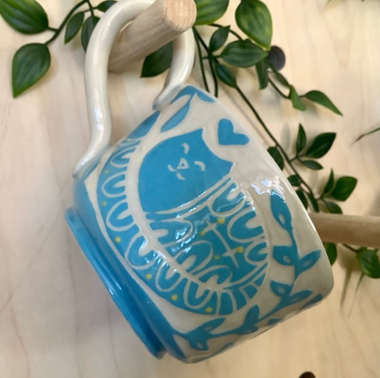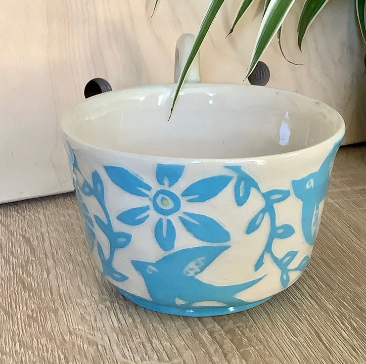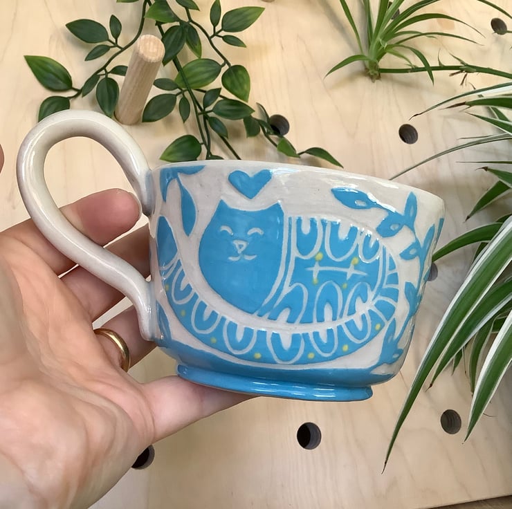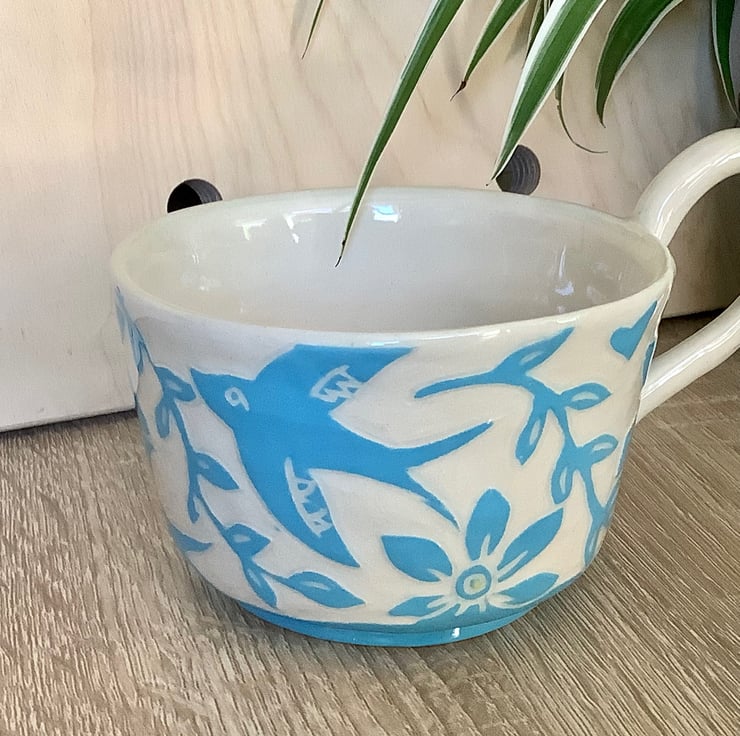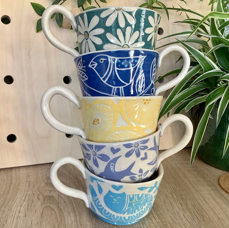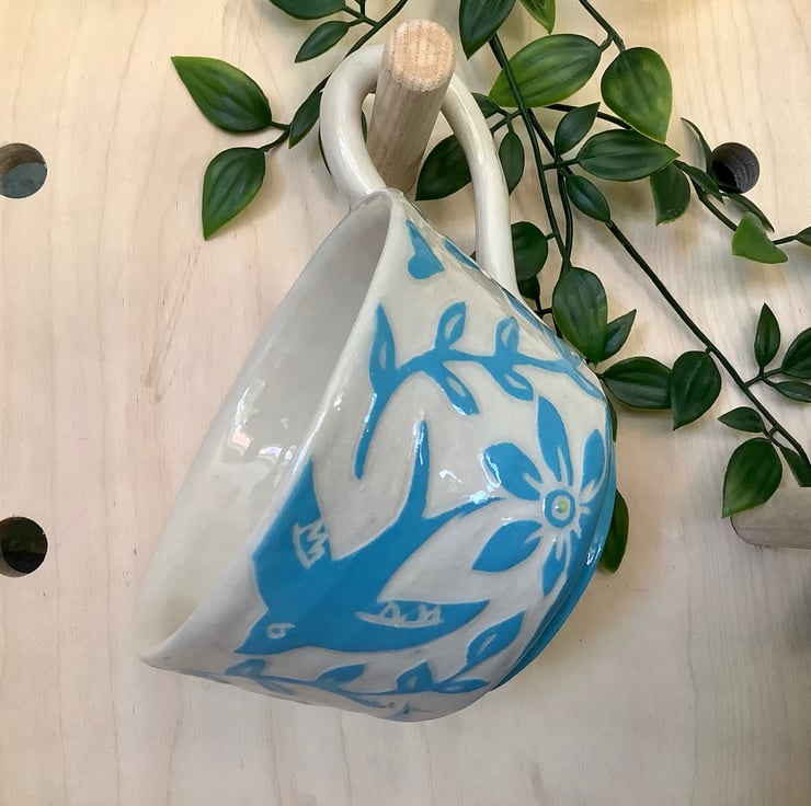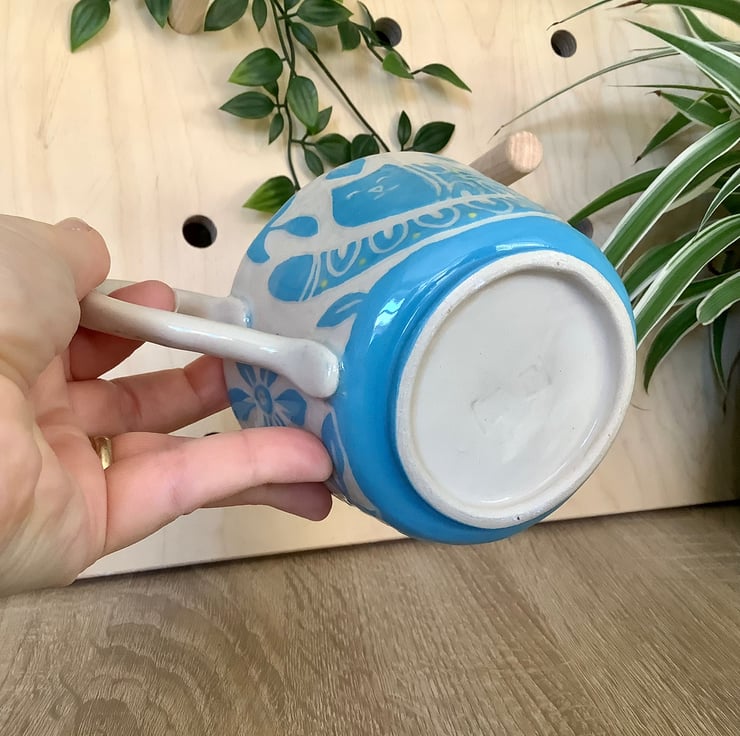 This lovely sgraffito mug measures approximately 11cm x 7cm and hold 350ml of liquid. It is made of stoneware so is very robust and can be used in the microwave, oven, dishwasher and is also frost proof. The design is carved into layers of coloured slip that are applied when nearly dry. Each piece is unique with its own individual quirk’s. Makes a great gift and can be used along side my coasters and small dishes.