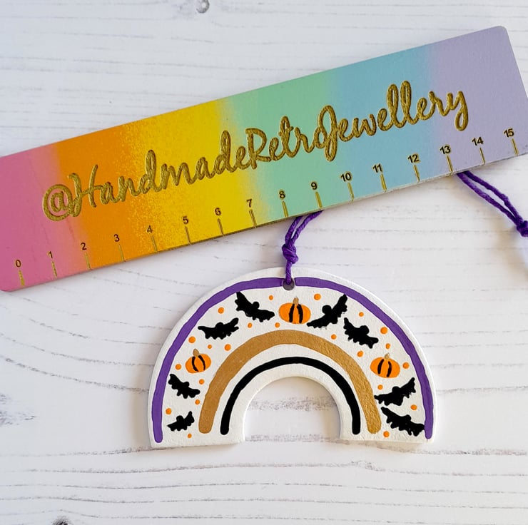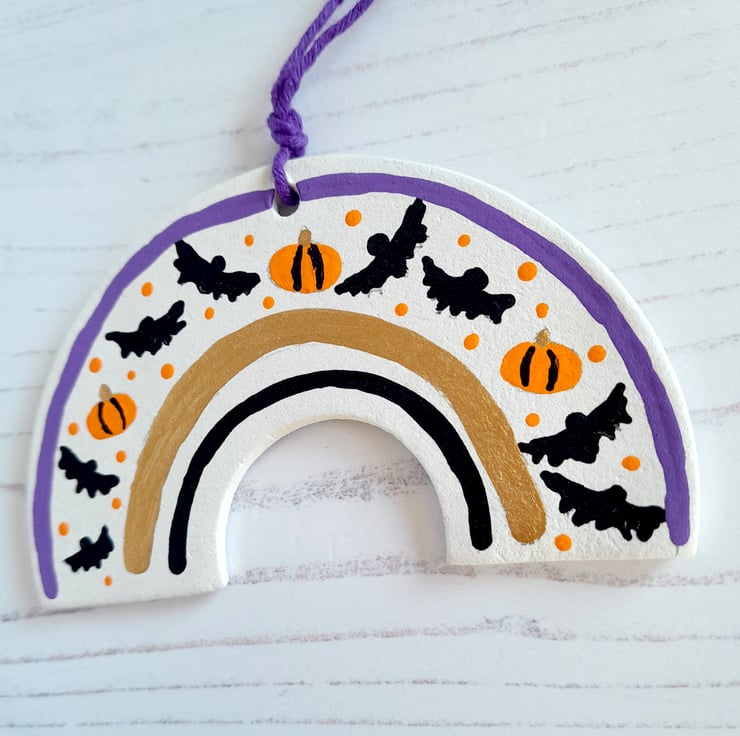 A gorgeous handmade rainbow shaped decoration, made using air dry clay, then a Halloween design, featuring bats and pumpkins is hand painted using acrylic paints. The rainbow is then sealed with a matt varnish, before having twine attached, ready to hang in your home!