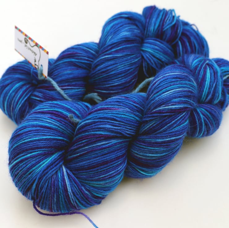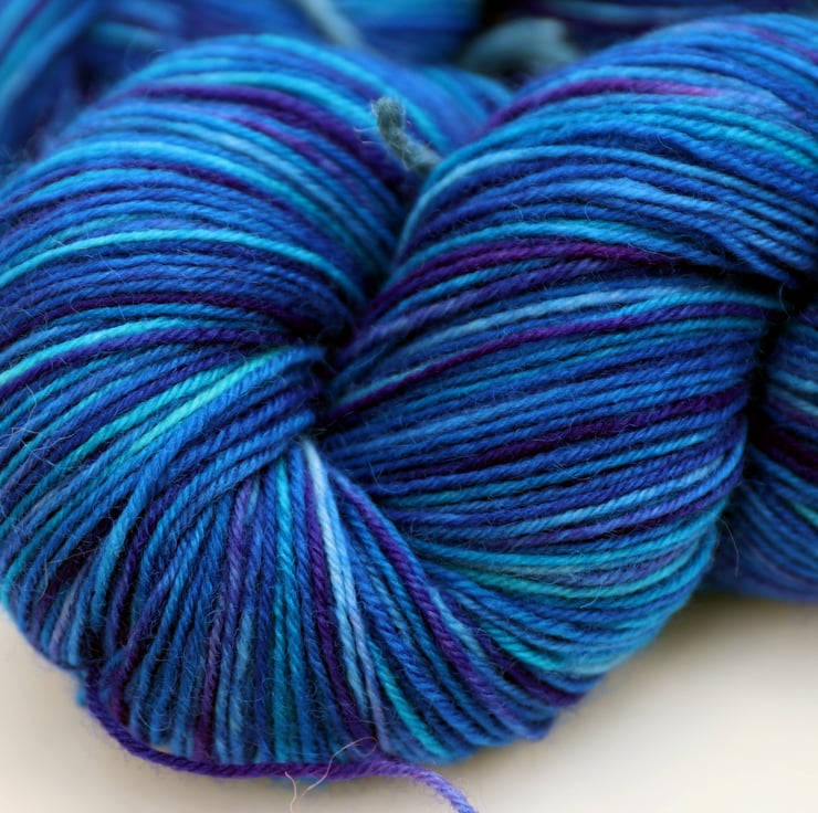 Blue with purple and light cyan. This Bluefaced Leicester superwash yarn is soft with a very slight lustre. There are two skeins available (price shown is for one). Photos taken and edited in bright natural light.