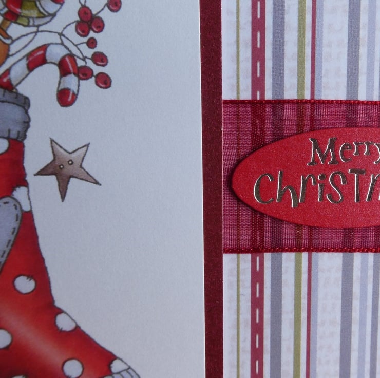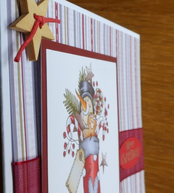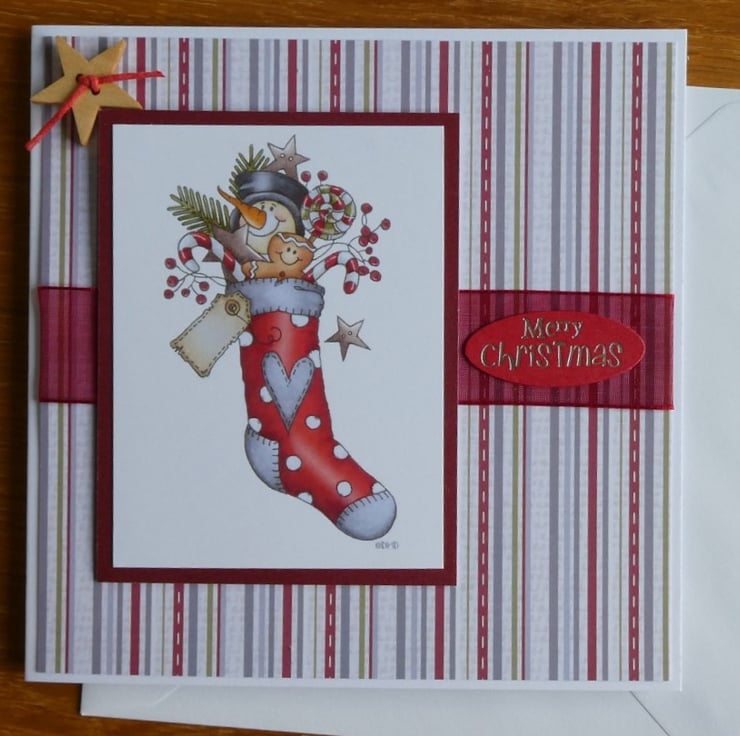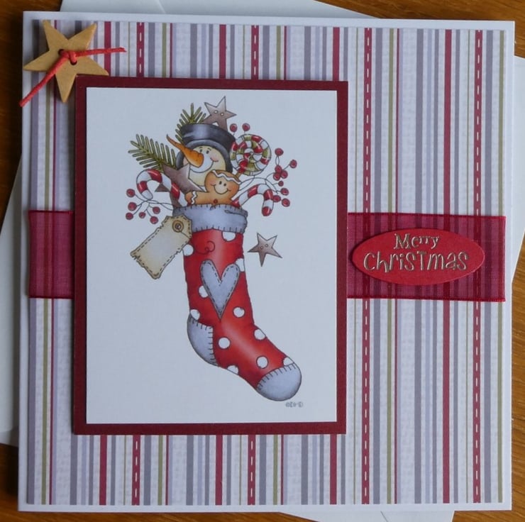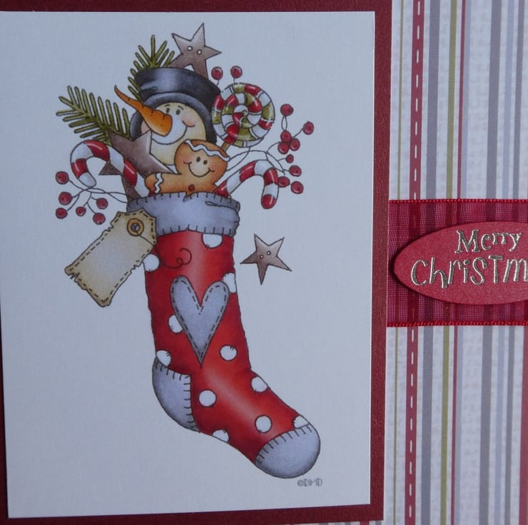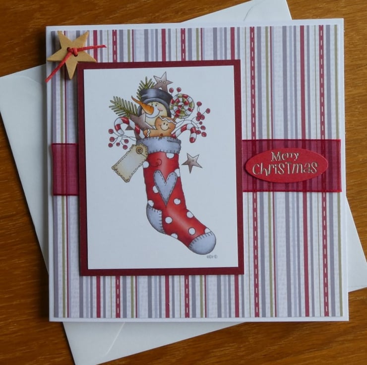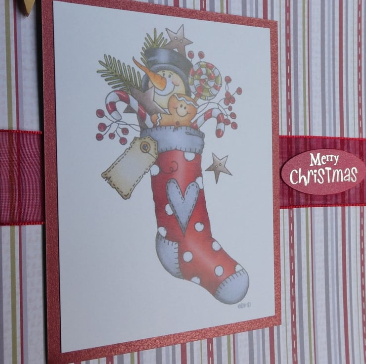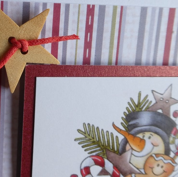 This cute Christmas card has a printed topper showing a snowman wearing a top hat peeking out of a heart patterned Christmas stocking, complete with a gingerbread man and candy canes.