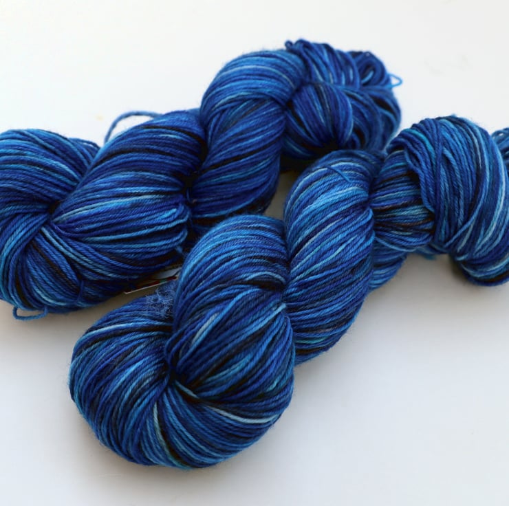 Blue with dark grey and mottled lighter blue sections. This is a standard 4-ply 'sock' yarn with a nylon content to add robustness. There are two skeins available, price shown is for one. Photos have been taken and edited in bright natural light.