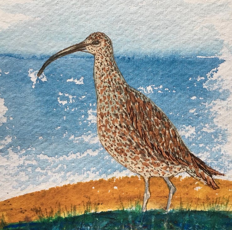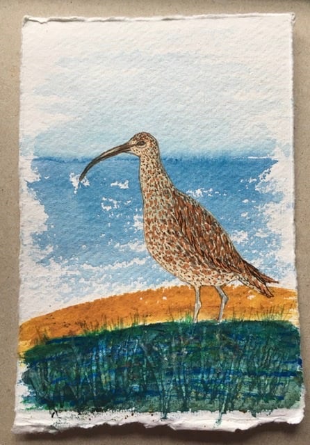 This is painted on 15cm x10 cm hand made watercolour paper using Artist quality materials, and shows a curlew between the marsh and the seashore. It will be sent with a mount, packaged in a cello bag and envelope, post free to UK destinations.