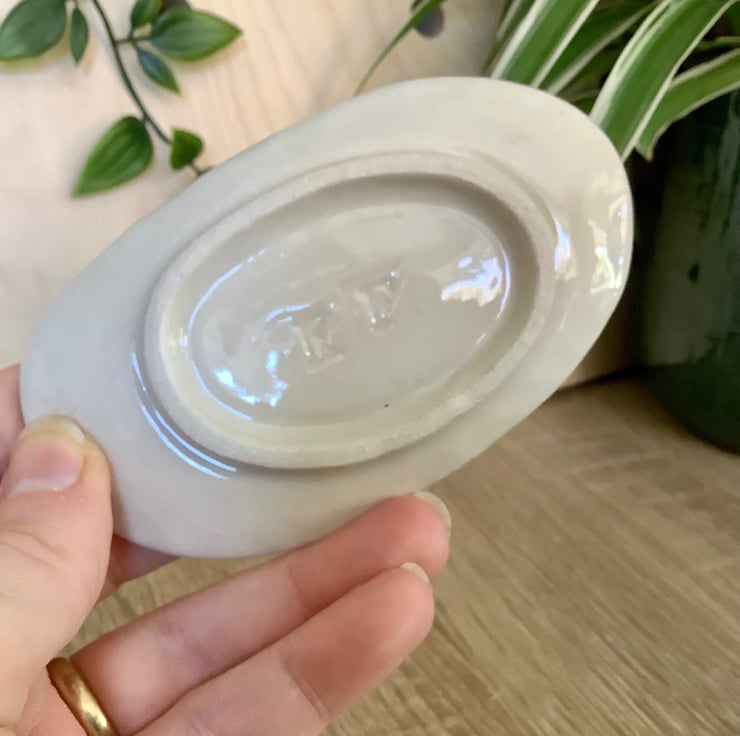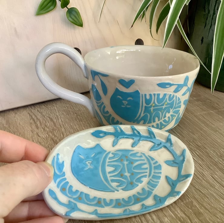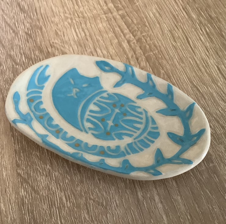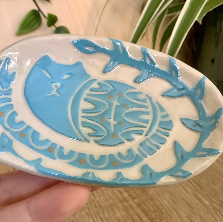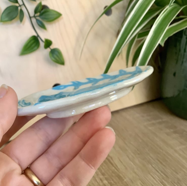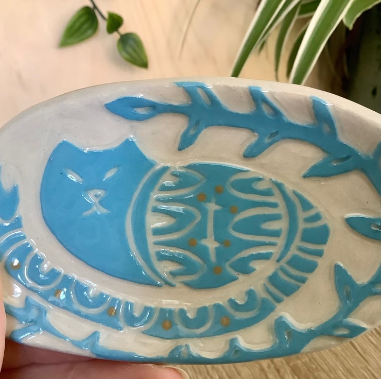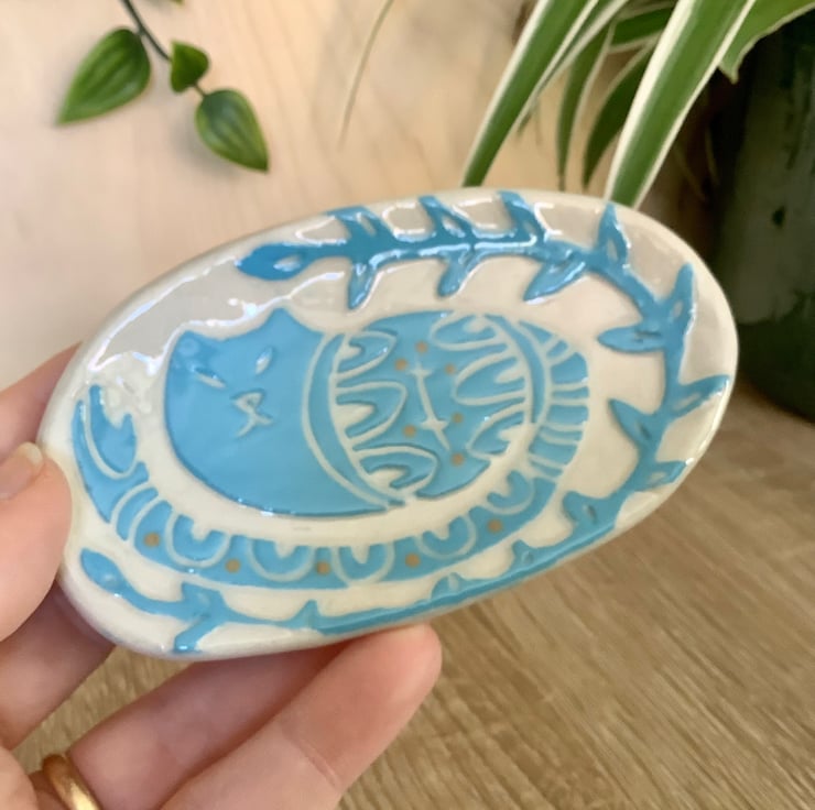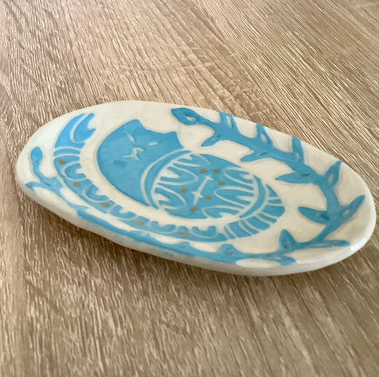 Handmade stoneware dish, measuring approximately 10cm. Slightly dish shaped with foot ring. Decorated using the sgraffito technique, where the design is carved into layers of coloured slip. I then finish with small dots of contrasting colours. Each is unique thanks to the hand carving technique. Dishwasher and frost proof, made for everyday use.