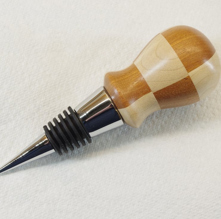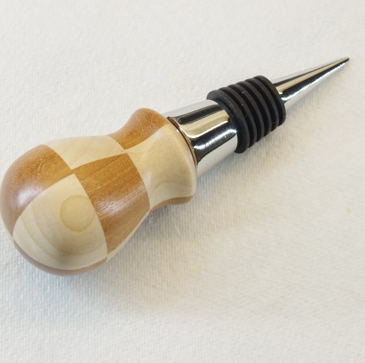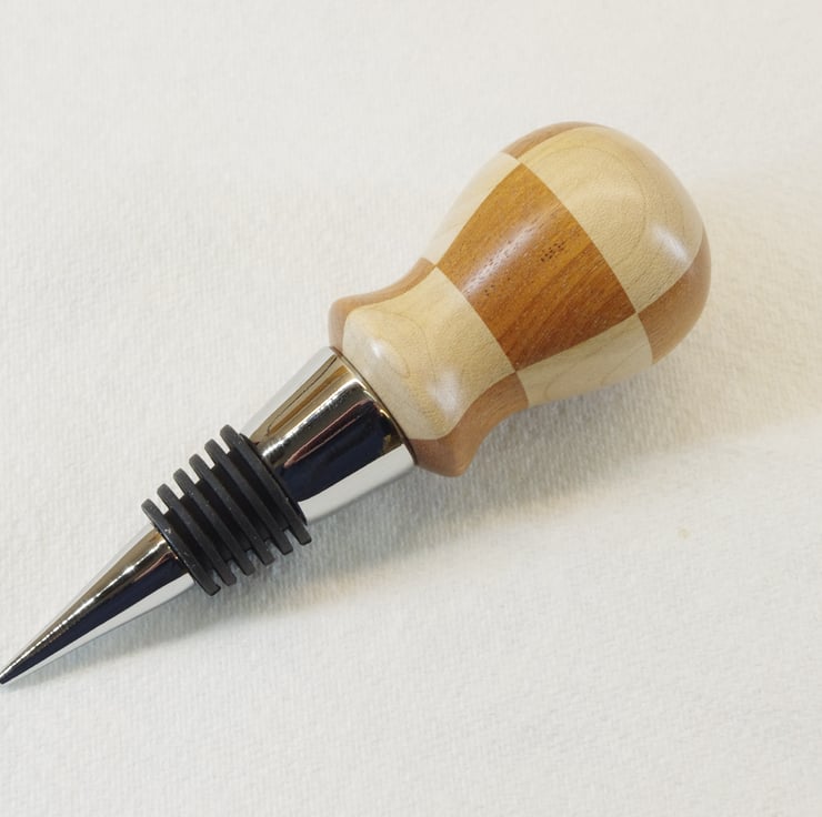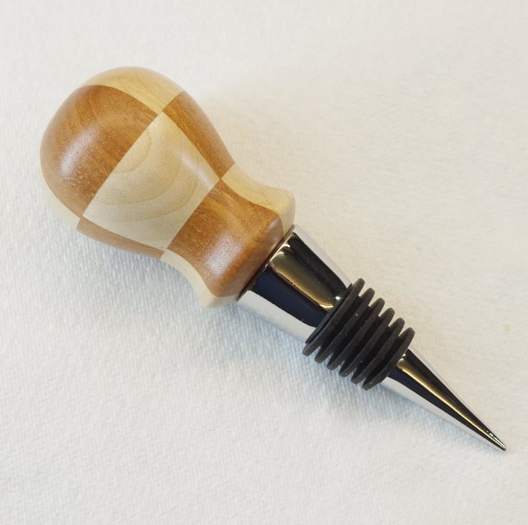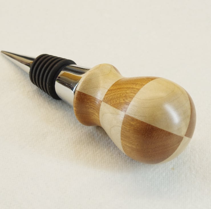 This handsome hand-turned bottle stopper is made from Sycamore and Mahogany.