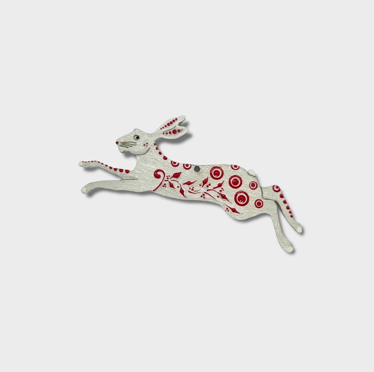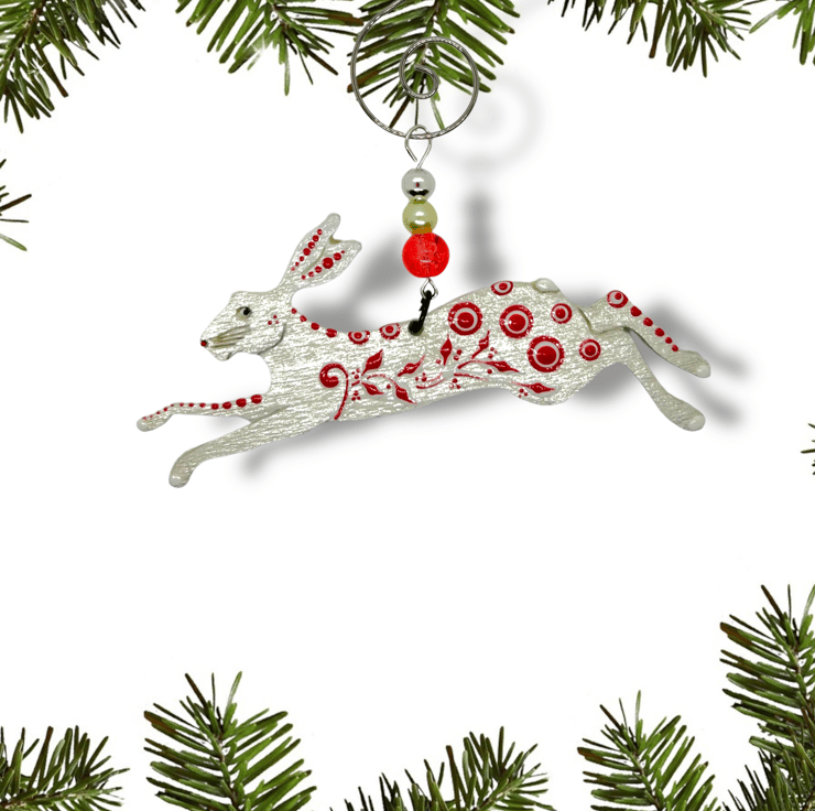 A hand-painted Running Hare Christmas tree ornament