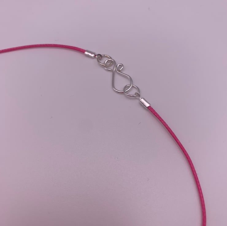 When worn this necklace tends to sit just above the collarbone and is made from polyester cord and sterling silver, finished with a sterling silver shepherds hook clasp.