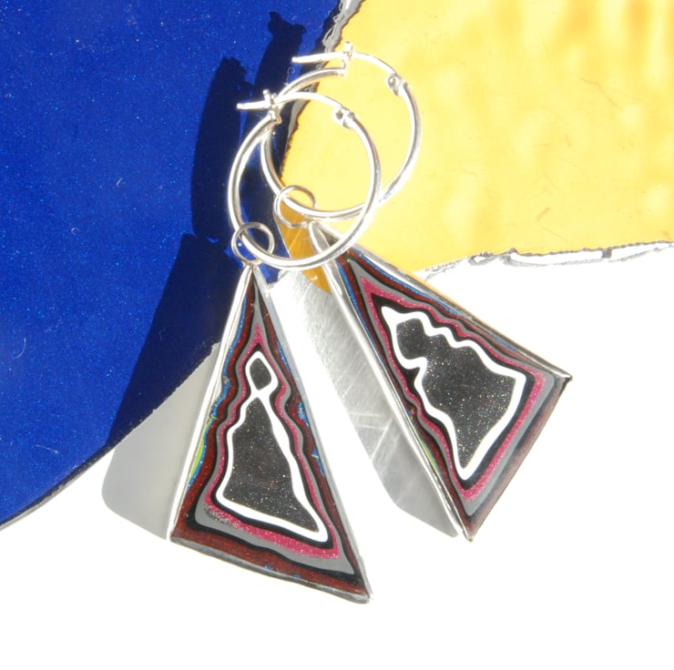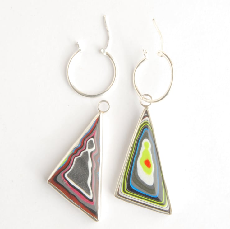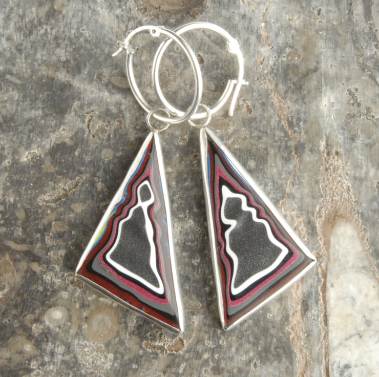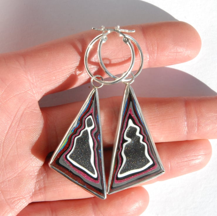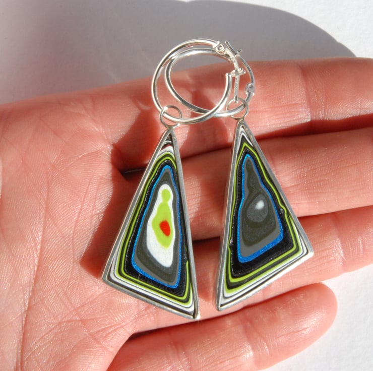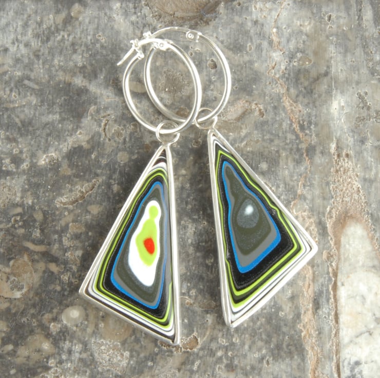 These hoop earrings have edgy triangular drops of fordite which can be slipped off the sterling silver hoops and reversed to show a completely different pattern and colour palette. The 'front' has roughly concentric triangles of sparkly grey, pink and red with non sparkly black, white and grey. The 'reverse' has sparkly blue and silver with bright green, drab green, black and white. The hinged hoops measure 20mm diameter and the drops are 47mm by 20mm (total drop of hoop and fordite is 64mm). Fordite is lightweight so they would be comfy to wear all day.