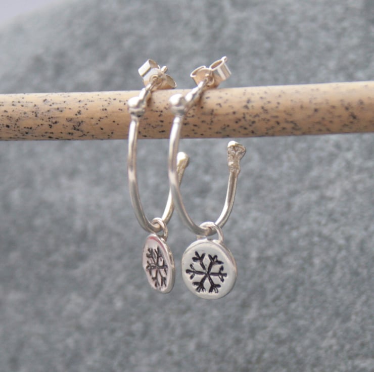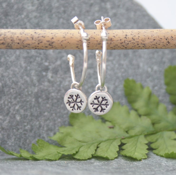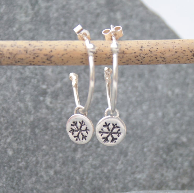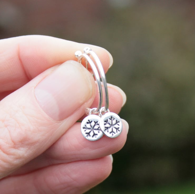I have created a silver hoop which attaches to the ear with a silver pin and a butterfly back. On the silver hoop there is a charm with a hand stamped snowflake. This is free to move around the hoop but can't fall off due to a silver granulation ball soldered to the end.