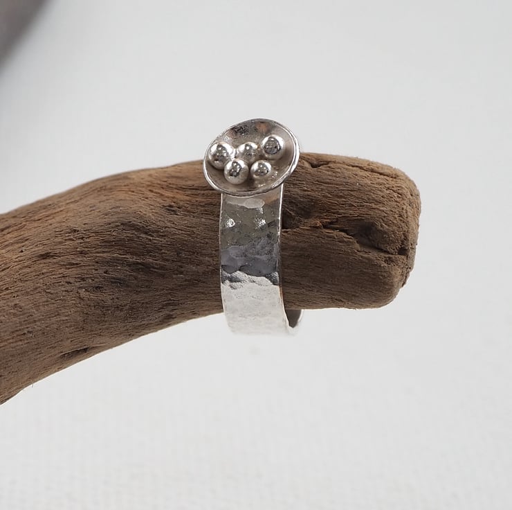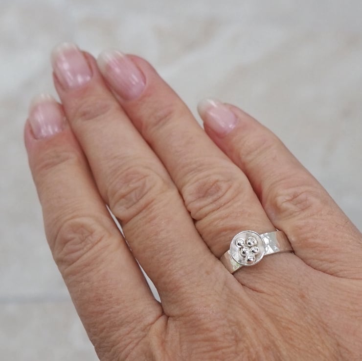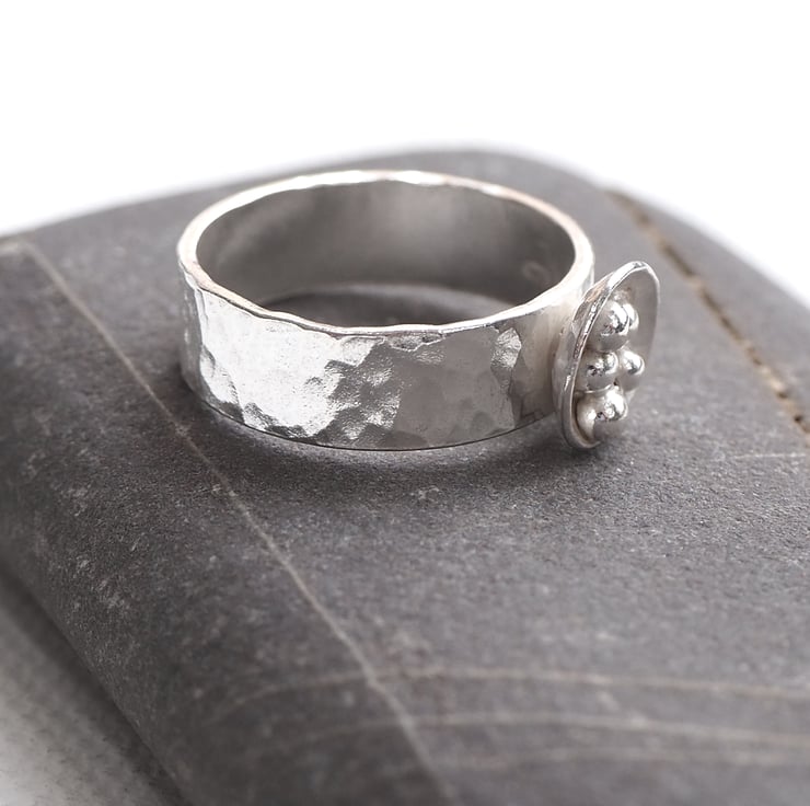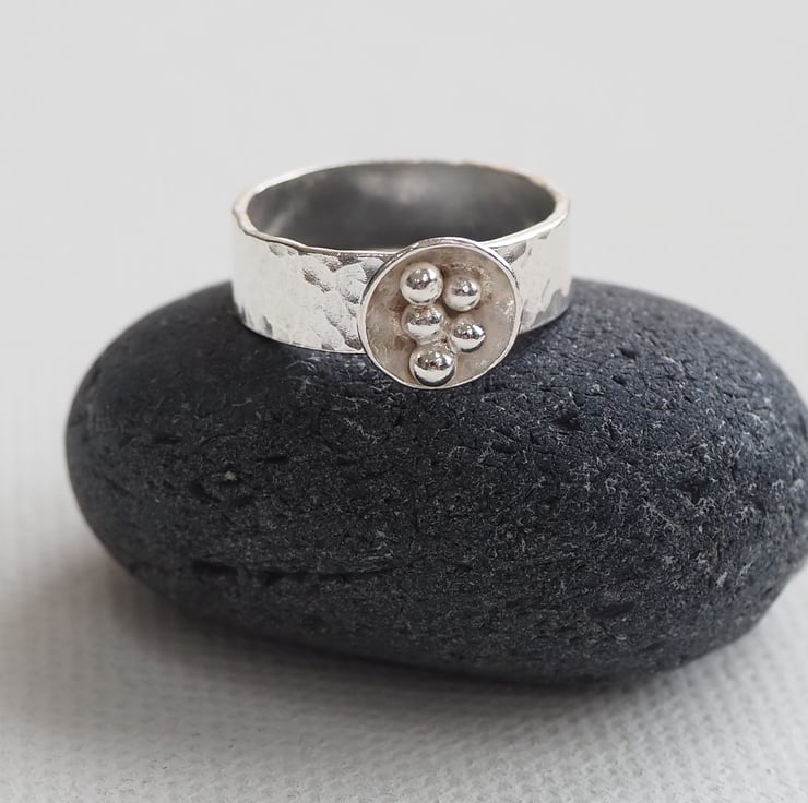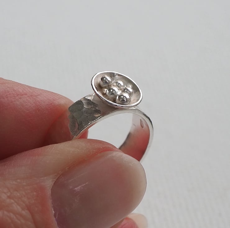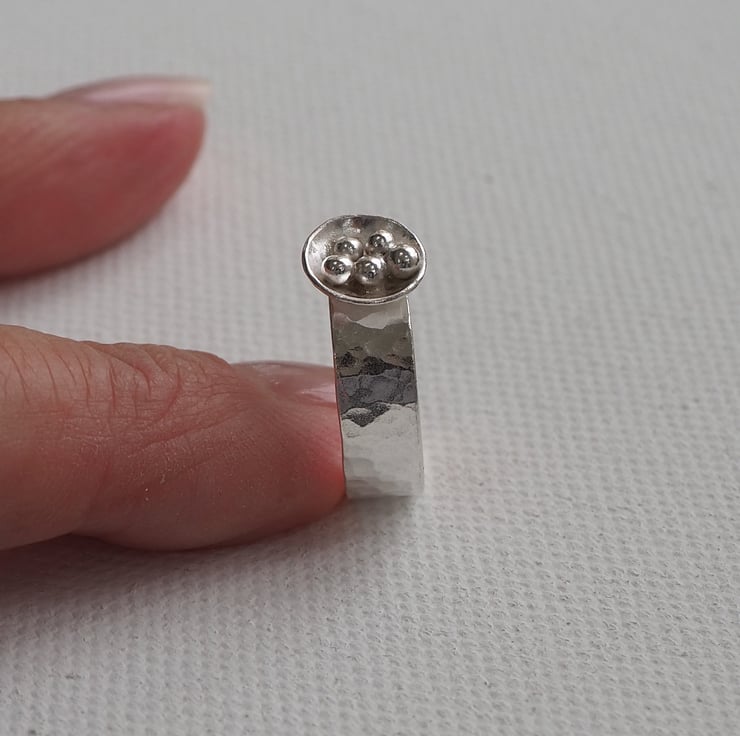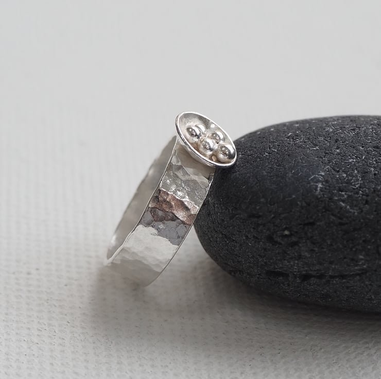 This hammered silver nest ring is created from a nest (domed disc) of sterling silver set onto a wide band of sterling silver. The nest contains 5 little balls of recycled silver.