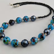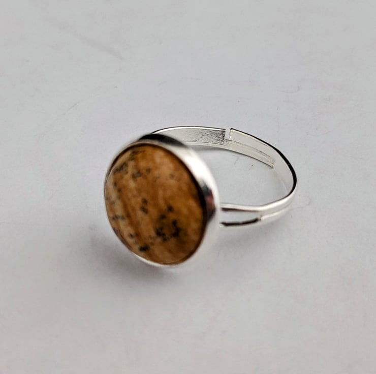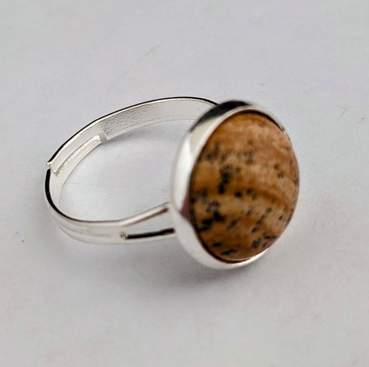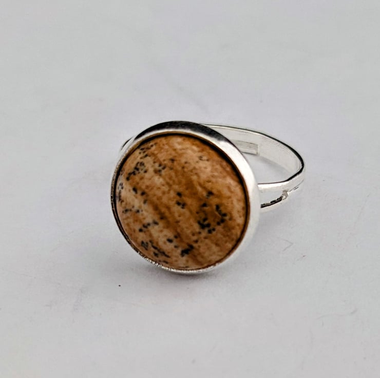 12mm Picasso jasper cabochon in adjustable silver plated ring setting. In an organza gift bag.
