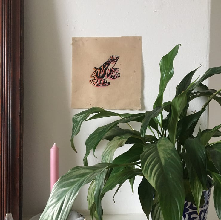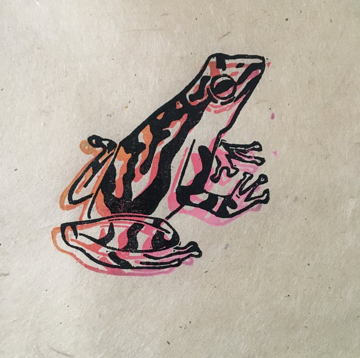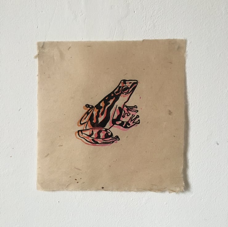 A linocut print of a tropical frog on handmade Nepalese lokta paper. The image has been printed twice, once as a "sunset fade" of pinks, yellows and reds, then again in black to create a slightly trippy visual.