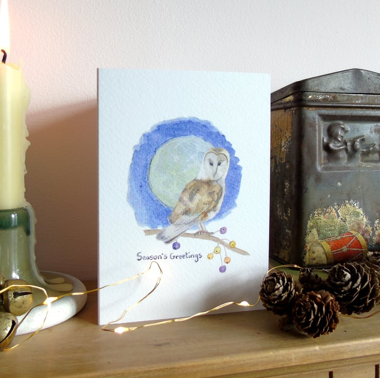 A magical Christmas card featuring my watercolour paintings of a barn owl and the full moon printed onto tintoretto gesso card for a luxurious feel.