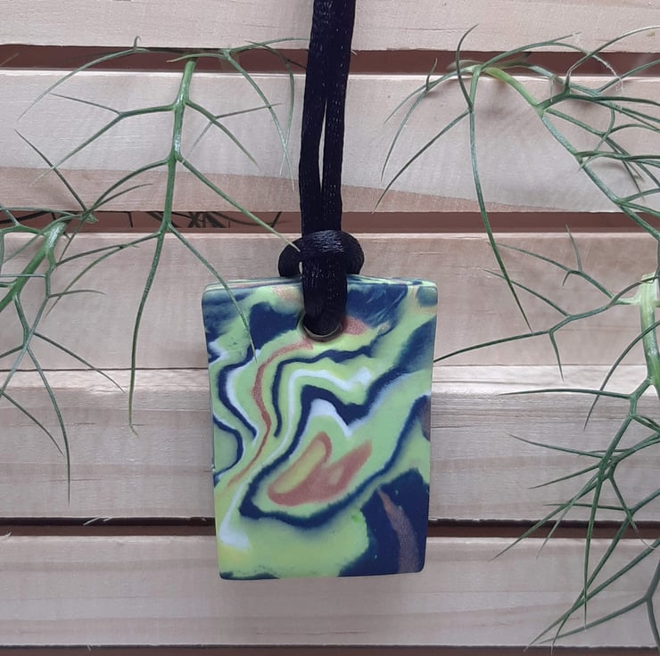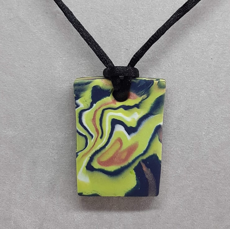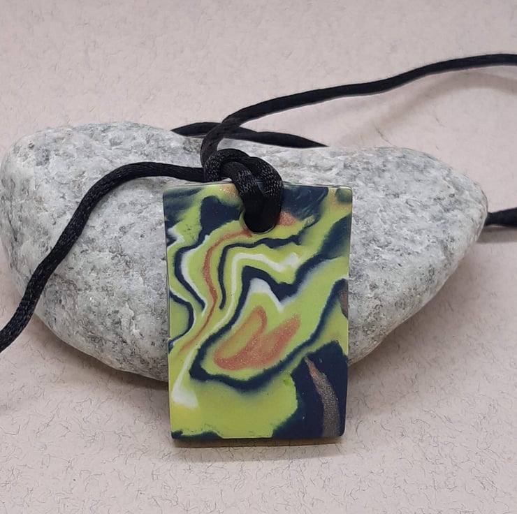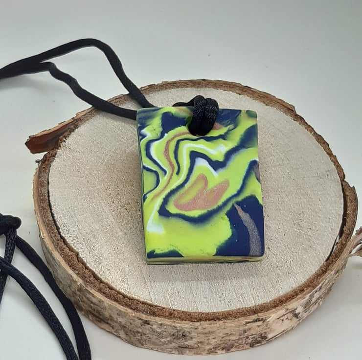 A handmade pendant made from a blend of lime green, sienna (with a hint of sparkle), navy and white polymer clay in a unique swirl design.