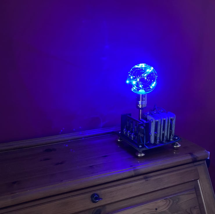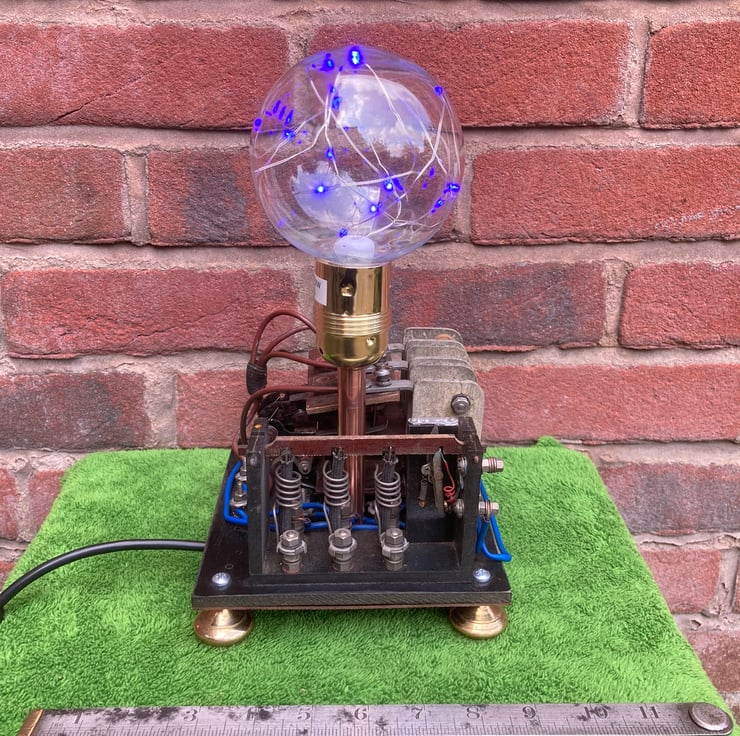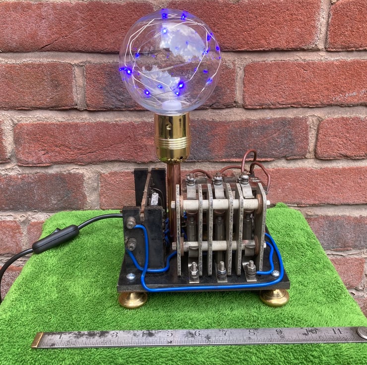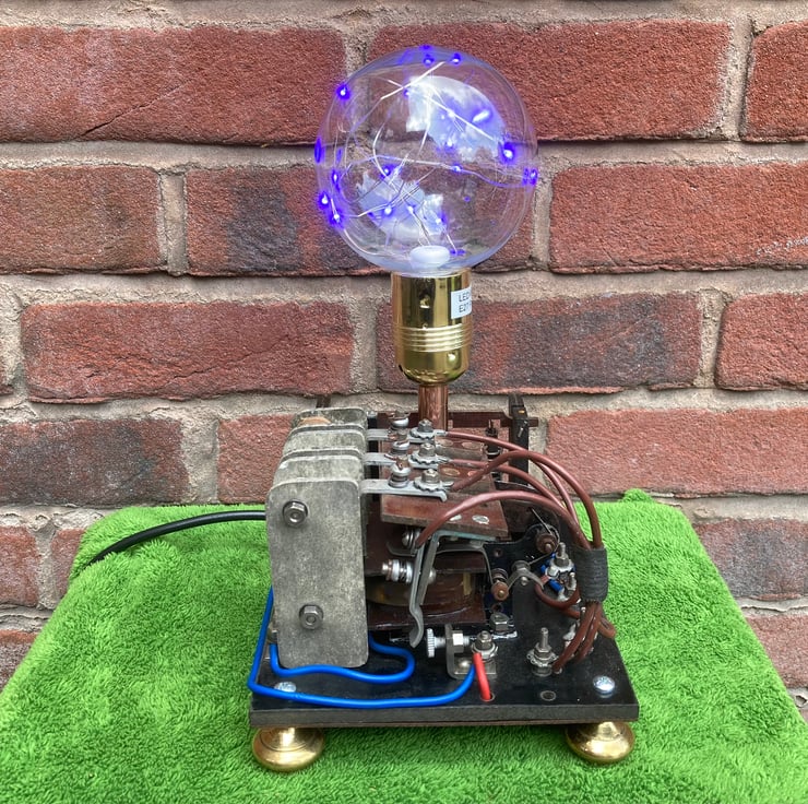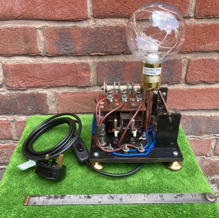 A unique Steampunk themed table lamp. The base is made from the original 1955 3 phase electrical starter contactor and overload cut-out from my lathe, redundant after I converted the lathe to single phase power. I thought the contactor had a real steampunk/gothic/Frankenstein feel, so I just had to make something along those lines with it.