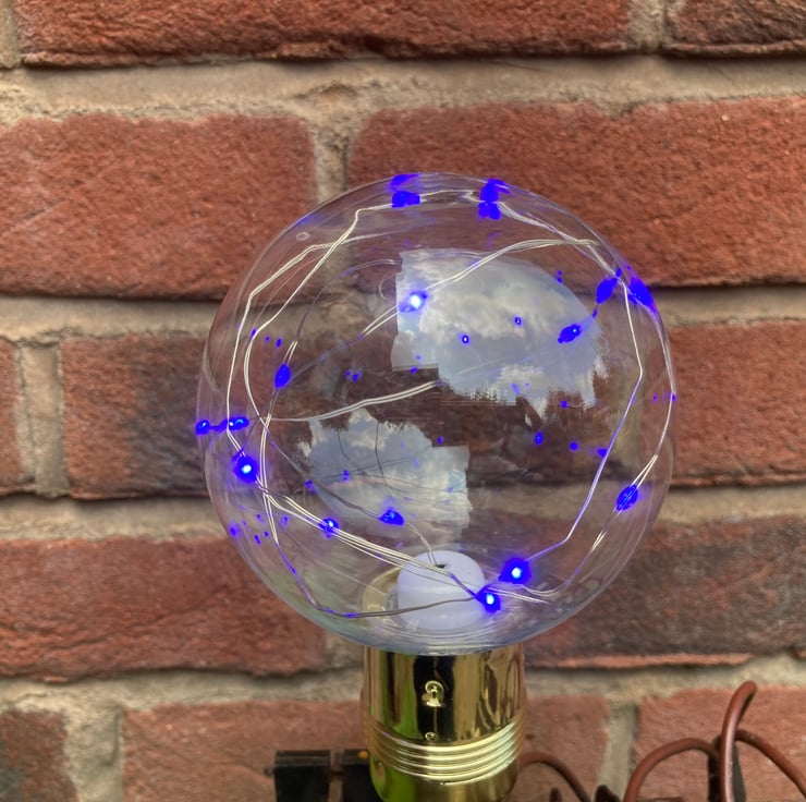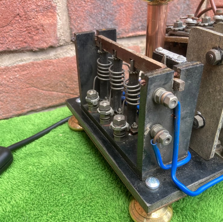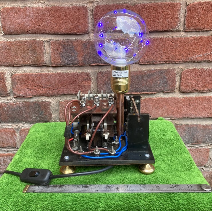 A length of reclaimed copper water pipe, a couple of adaptors turned on the lathe the contactor came from was mounted to the Bakelite base plate with a brass ES fitting lampholder on top. I added some brass cupboard door knobs for feet, new live electrical parts and the result is the quirky and unique table lamp you see in the photos, looking straight out of a mad scientist’s lab! The bulb fitted is an economical blue LED decorative item which I think suits the feel of the lamp very well and is included in the price.