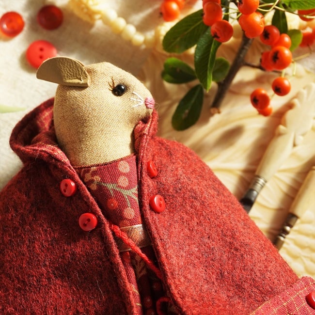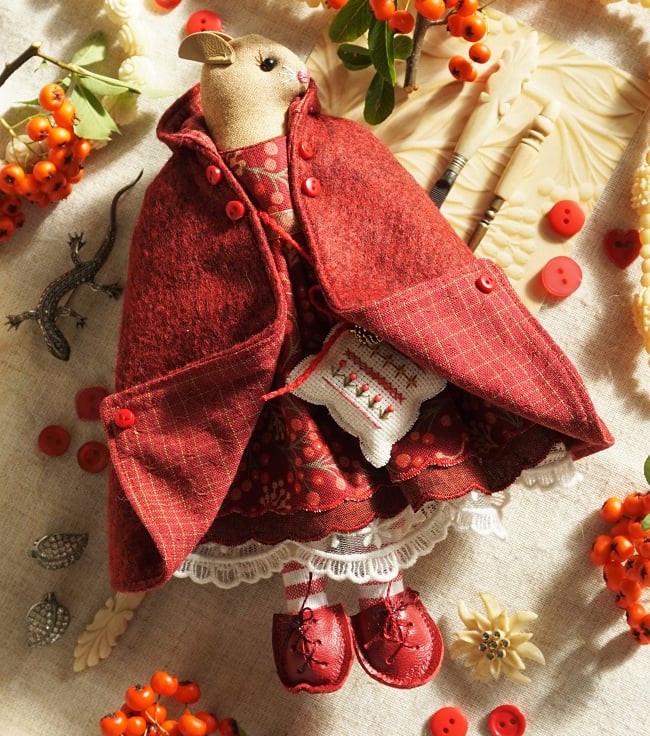 A warm winter cape keeps this little mouse safe from winter chills, lined with a russet red slubbed yarn dye fabric she looks super snug xx