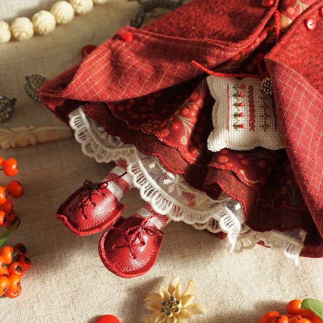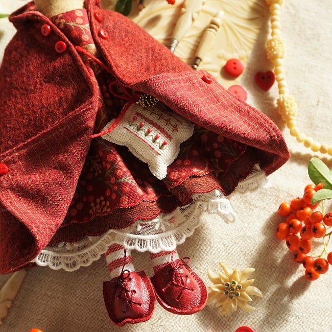 This is Crimson, a tiny winter berry Christmas mouse in a wool cape. She is a hand embroidered mouse with little leather ears and tail. She is dressed in a Winter Berry print, a red ground with berries in a range of reds with russet tones. She has coordinating underskirts in russet shot cotton, cream tulle mesh and cream cotton lace bloomers. To keep warm she has a wool cape lines with a Japanese yarn dye cotton. Her dress is finished with organza ribbon, tiny buttons and little leather shoes. She is a brown mouse with brown ears, a pink tail with white whiskers and a pink nose with little black bead eyes.