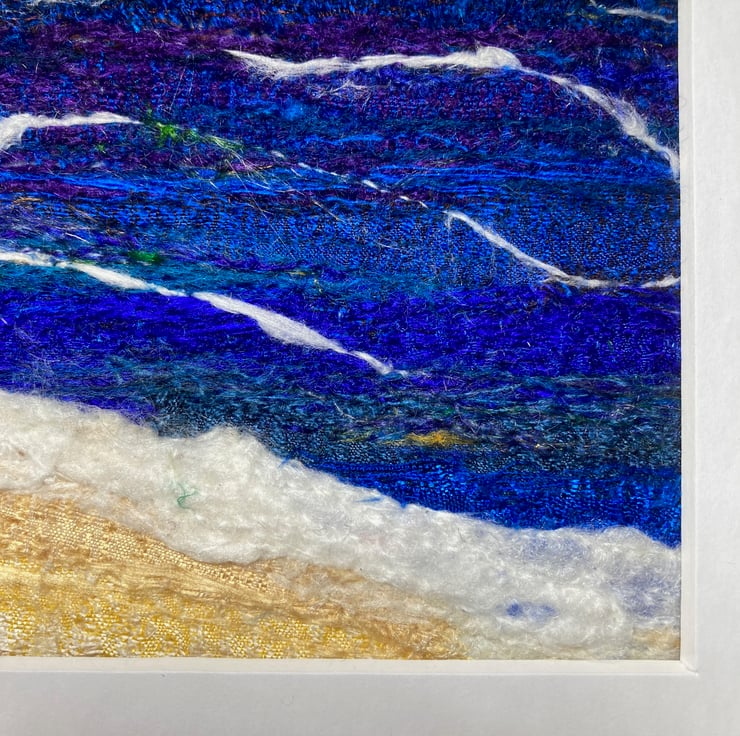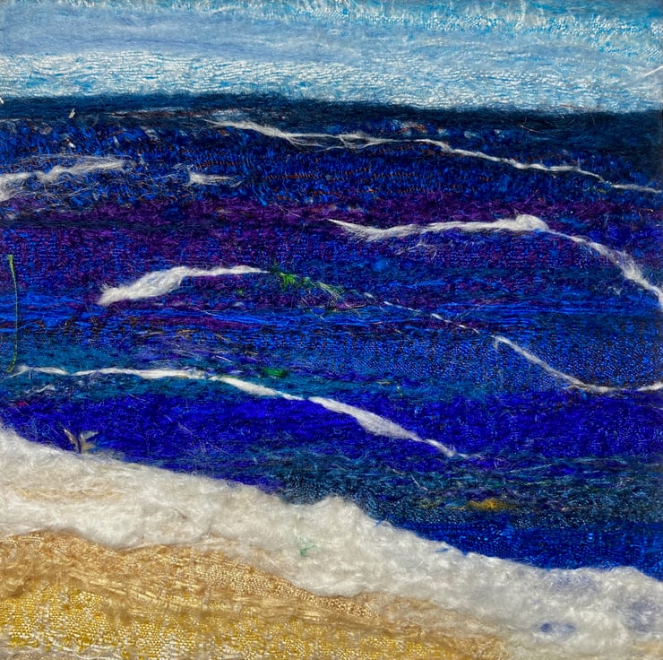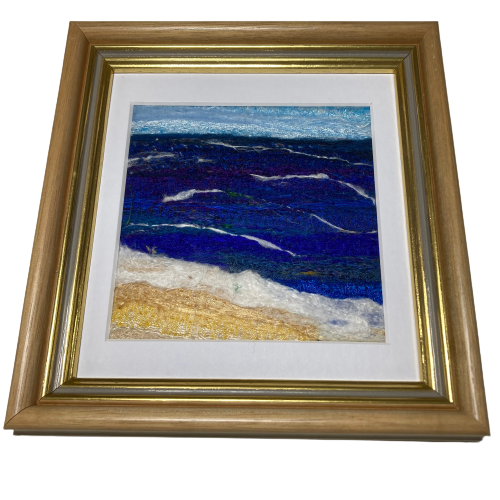 A textile picture made from strips of silk fabric depicting a choppy sea. The silk fabric in various colours has been needle felted to a piece of backing felt. Various other wool and silk fibres have been added in small amounts to blend the colours together, enhance the picture and add detail and texture. The process of needle felting the fabric and fibres creates a wonderful texture to the work and binds everything together, negating the need for any sewing.
