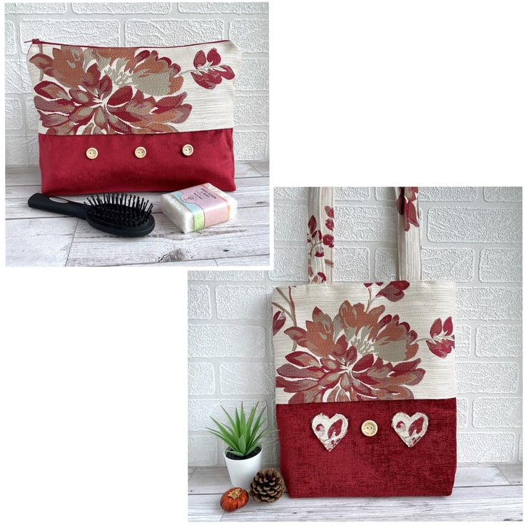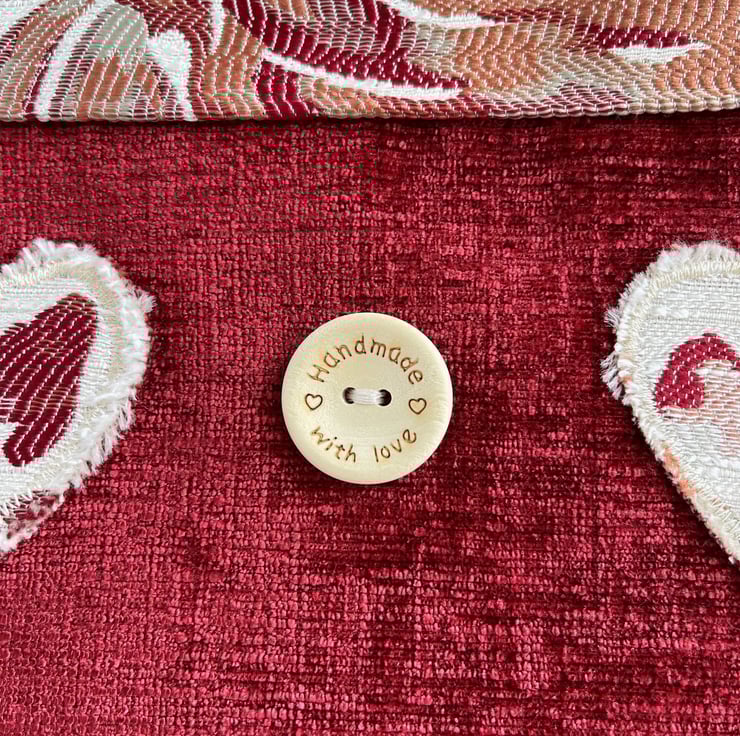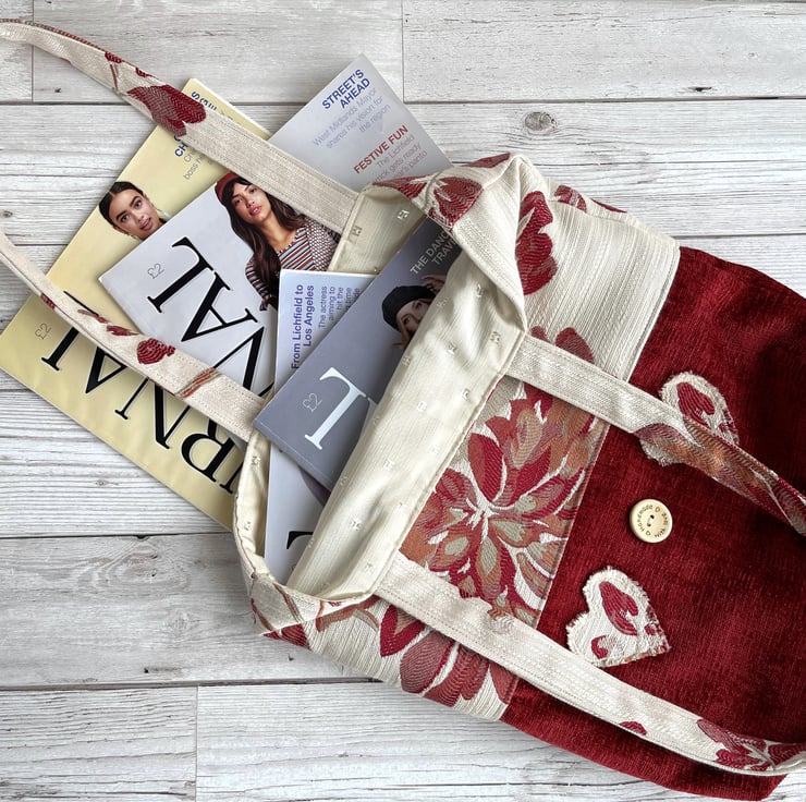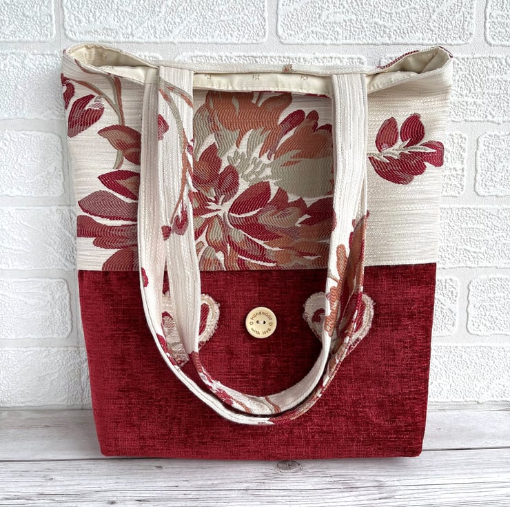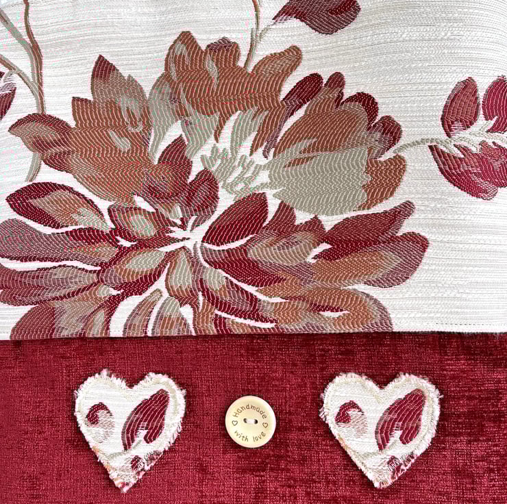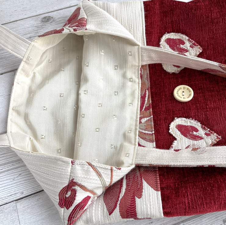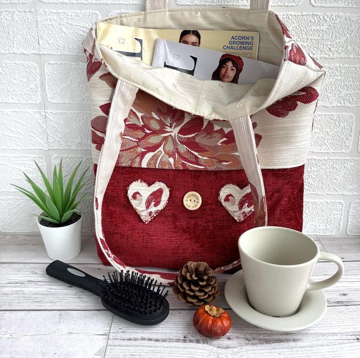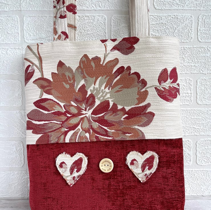 Red tote bag with flowers and hearts. This lovely tote bag is made from two luxurious fabrics which complement each other beautifully. The upper part of the bag and the handles are made from cream brocade fabric with a bold floral pattern in rich shades of red, russet and beige. The lower part of the bag is made from luxurious red textured fabric. To the lower section of the bag I've added two appliqué hearts and a large wooden button. The hearts are made from the same floral fabric as the upper section of the bag, and I've frayed the edges to give a lovely rustic touch. The button is natural wood coloured and is inscribed with the words "Hand made with love" and two tiny hearts. The bag is lined with cream fabric with a woven pattern of small squares.