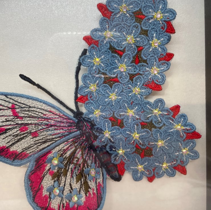 Machine embroidered bluebell floral butterfly, stitched onto organza. Hand cut with AB crystals applied to each flower centre. Mounted onto pearl paper in. Black square deep shadow box frame . Acrylic safety glass.