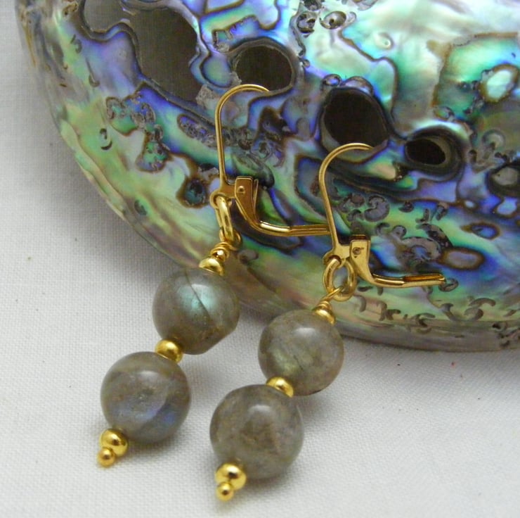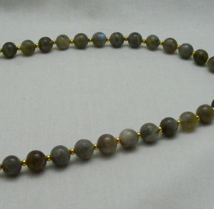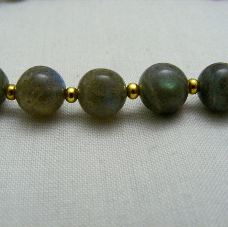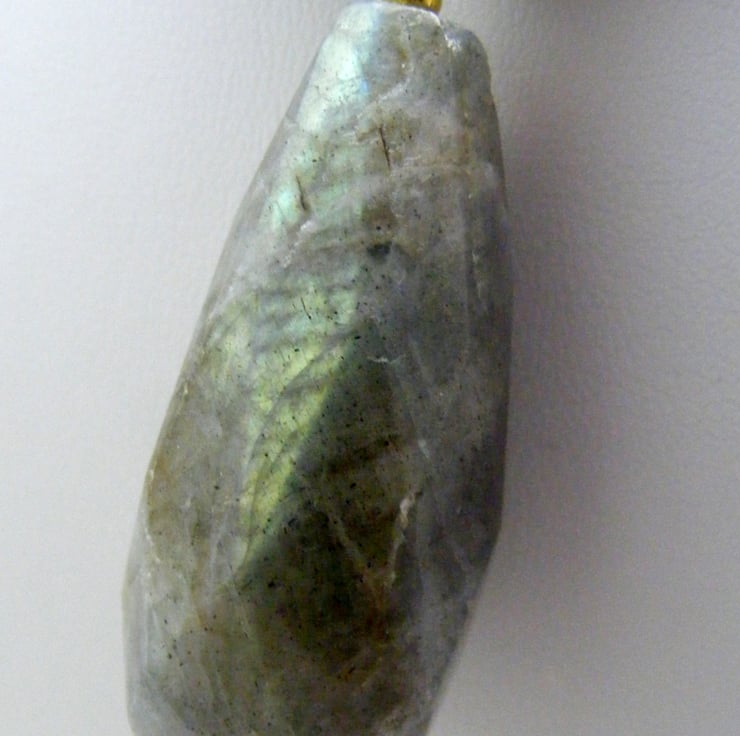 Labradorite has a lovely schiller. Under a light source you can see blues, greens and golds which are similar to the northern lights.