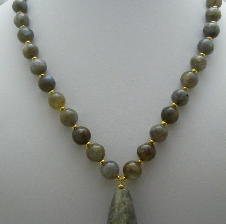 One of a kind, gemstone jewellery set comprises of, a necklace with matching earrings. Handmade using, 40x18mm Labradorite pendant, 10mm labradorite round beads, 3mm gold plated rondelles, gold plated findings, gold plated toggle clasp for the necklace and gold plated lever backs for the earrings.